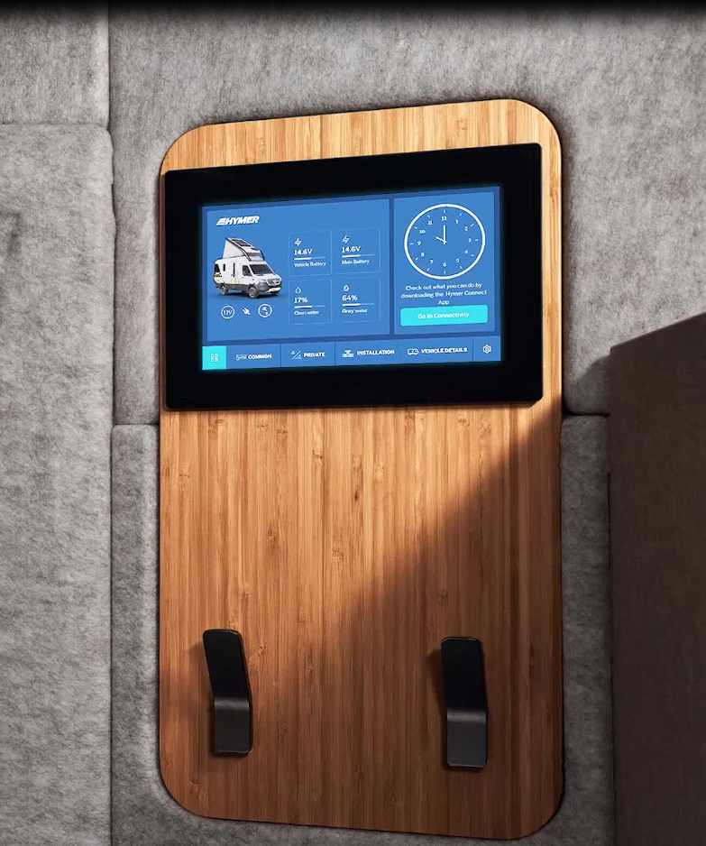 车内装置了智能房车控制系统,可以通过中央控制器或HYMER Connect 应用程序,随时控制VentureS中所有兼容系统,提高旅途生活的安全性、舒适性。