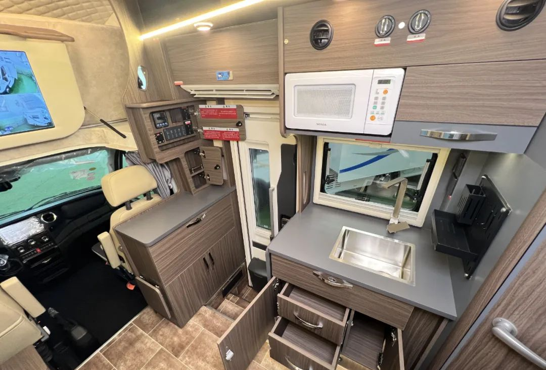 整车基于进口依维柯New Daily底盘打造,外尺寸为5990×2490×3180mm,动力搭载3.0T柴油发动机,匹配采埃孚8AT自动变速箱,核载6人,蓝牌C照即可驾驶;水电配备300L净水箱、45L灰水箱、80L黑水箱、48V 250Ah锂电、48V 4000VA充逆变一体器、1200W硬板太阳能供电系统等。