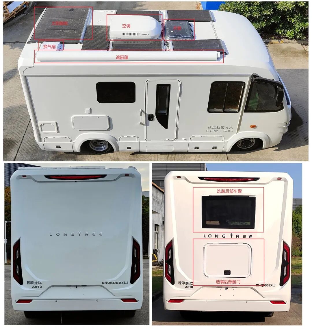 这款是隆翠首款基于自家底盘所打造的房车,目前国产房车的底盘所使用的大多是上汽、依维柯等品牌,而这次隆翠底盘的研发使用给国产房车市场带来了更多全新的底盘选择;房车外观配色以经典耐看的白色为主,质感十足;房车顶部及后部可选装后部舱门、后部车窗、天窗、遮阳蓬、太阳能板、空调等;左右两侧可选装封闭侧窗和舱门,还可选装其他型式的侧窗、舱门、加水口,并根据布置调整侧窗、舱门的数量和位置,根据自己的需求定制。