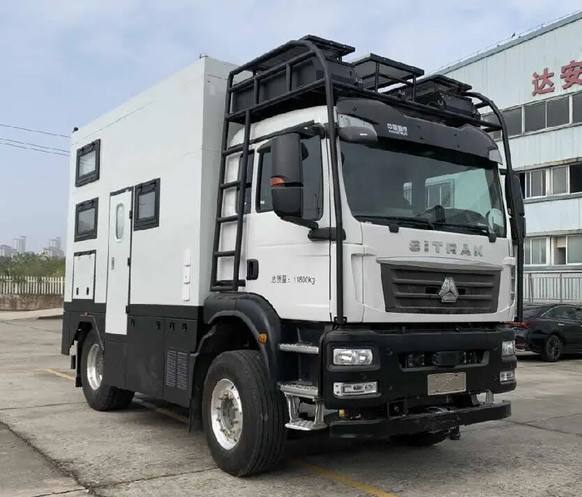 这是霍夫勒申报的首款重卡房车,延续了以往的硬派风格,基于中国重汽底盘打造,发动机功率最高可达202kW,具有强劲的越野性能;侧防护为裙边结构,离地高度420mm,后部防护装置材质为Q235,与车架纵梁螺栓连接,断面尺寸200x60mm,离地高度:440mm,能够在任何地形上行驶;整车外观尺寸为5999×2550×3780mm,核载4-6人,满足多人家庭出行;车身外侧可选装太阳能板、侧面车窗车门样式和后部车窗位置、遮阳蓬等。