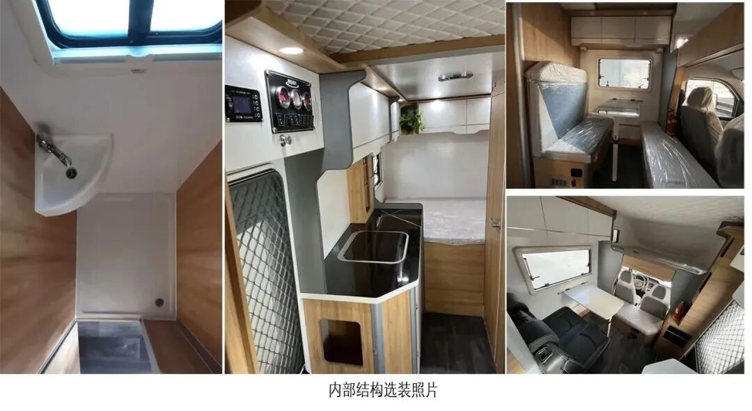 这款C型房车外观设计简约,使用DAM16KR发动机,最大净功率为85kW;整车外观尺寸为5440×2010/2070×2660/2680mm,核载4人,车身外侧可选装侧面车窗车门样式、后部车窗位置、太阳能板、遮阳蓬,以及额头样式和内部布局。