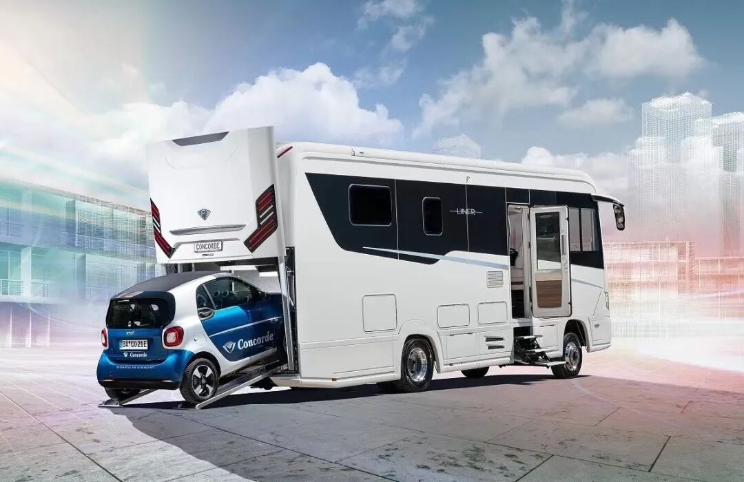 黑白的简易配色,经久耐看,车长接近11.5公尺,重量近7.5吨,在国内属于妥妥A照才能开的大家伙;动力系统搭载7.7升直列六缸大排量柴油引擎,最高可达300马力,动力充沛,能够到达任何你想去的地方。它之所以能够被称为豪华顶配版房车,最主要的原因在于它自带车位的设计,打开后备箱我们可以看到,里面并不是常规的储物空间,而是设计了可停放一辆小型轿车的车位空间,同时还安装了后轮气压式可调阻尼悬挂,防止车子在进出时刮伤底盘,设计时考虑的非常周到。
