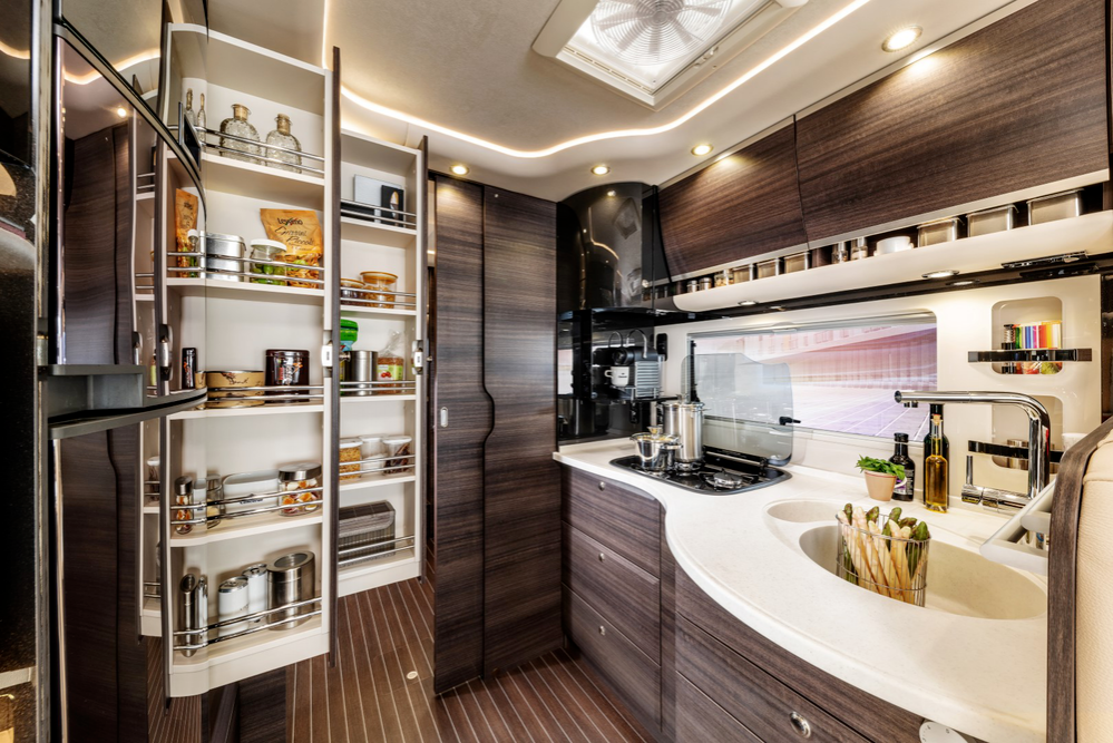 厨房区非常宽敞,一体式橱柜,配置了灶台、微波炉、洗碗机等基础设施,可以在旅途生活中尽情发挥你的厨艺;白色防水桌台便于清洗打理,上、下方都带有多格储物柜,可以摆放全套的餐具,右侧还带有两个大储物柜,可以存放些调料、零食、饮料等物品。