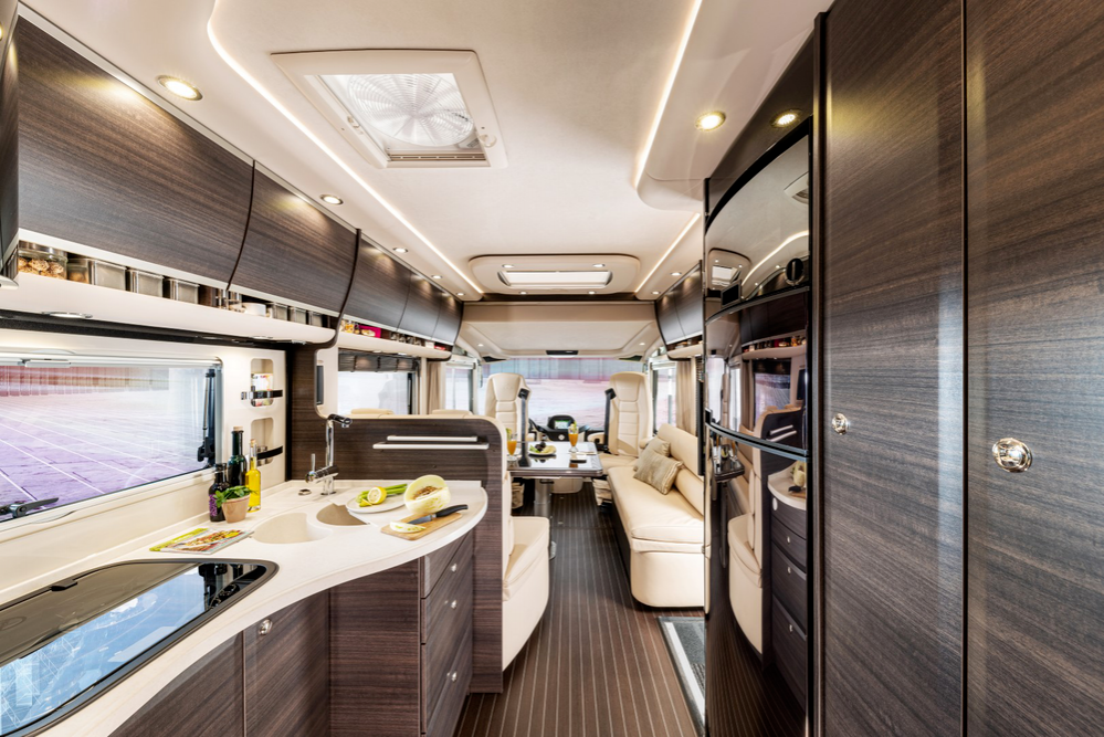 生活区布局规划合理,从前往后依次是会客区、厨房区、卫浴区、休息区,内饰整体是米色搭配深木色条纹板材,高级感十足;车内中部天窗搭配上吸顶式灯光、阅读灯、局部氛围灯,营造出了更加明亮温馨的居住空间。
