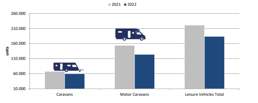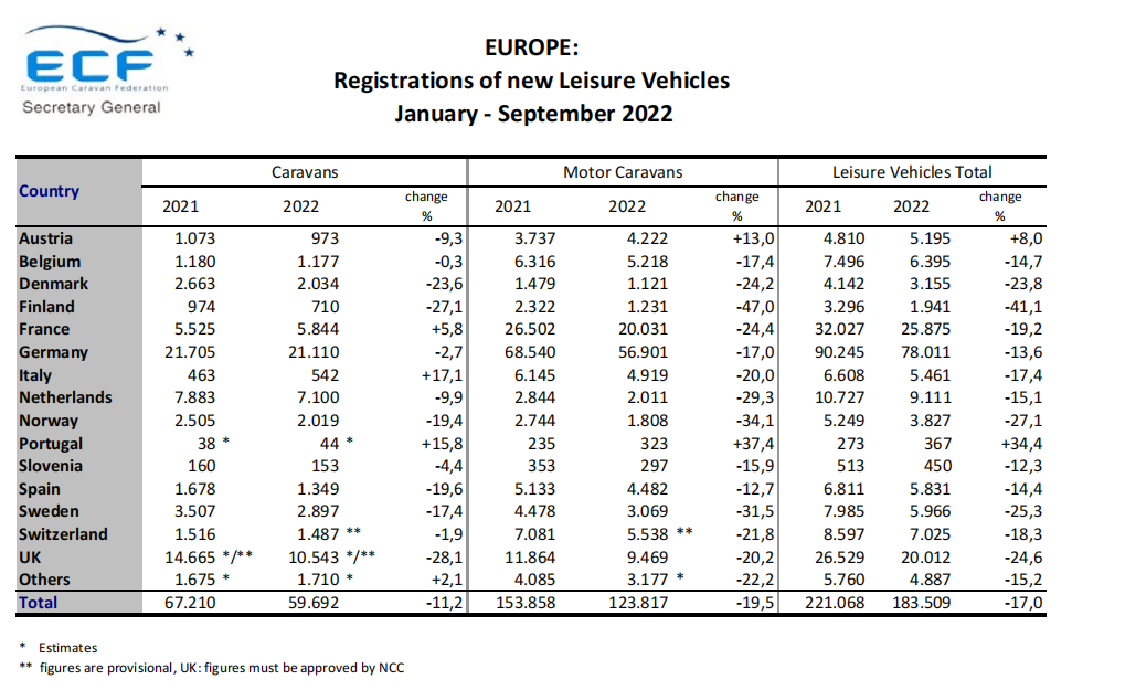 2021年的欧洲休闲车市场可以说取得了历史上最好的成绩,而今年虽然人们对房车的需求仍然很高,但供应链不足的问题阻碍了房车车辆的生产,同比去年新车注册量大幅下降。根据欧洲房车工业协会(ECF) 公布的前三季度的数据来看:欧洲房车市场新车注册量达到183509辆,较2021年下降了17%,自行式房车新车注册量达到123817辆,和2021年相比下降了19.5%,拖挂房车为59692辆,相较2021年下降了11.2%。