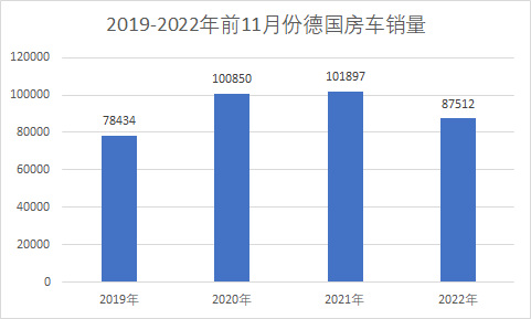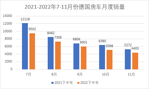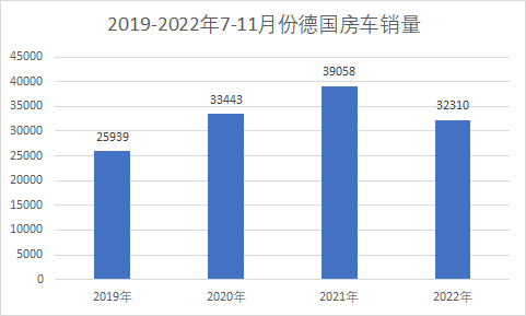 2022年7-11月份德国新注册房车32310辆,相较2021年7-11月的39058辆同比下降17.3%;其中,新注册自行式房车22843辆,相较往年同比下降21.4%,新注册拖挂式房车9467辆,相较往年同比下降5.2%。