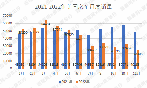2022年美国房车总出货量下降主要集中在下半年,已有数据中,7-10月的单月出货数据分别为29647辆(-33.4%)、33783辆(-36%)、28333辆(-48.5%)、32652辆(-43.7%),11月下降最为严重,单月房车批发出货量为24445辆,相较2021年11月49135辆同比下降50.4%,这一数字也是自2016年以来最低的月度发货量。