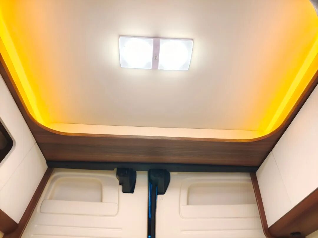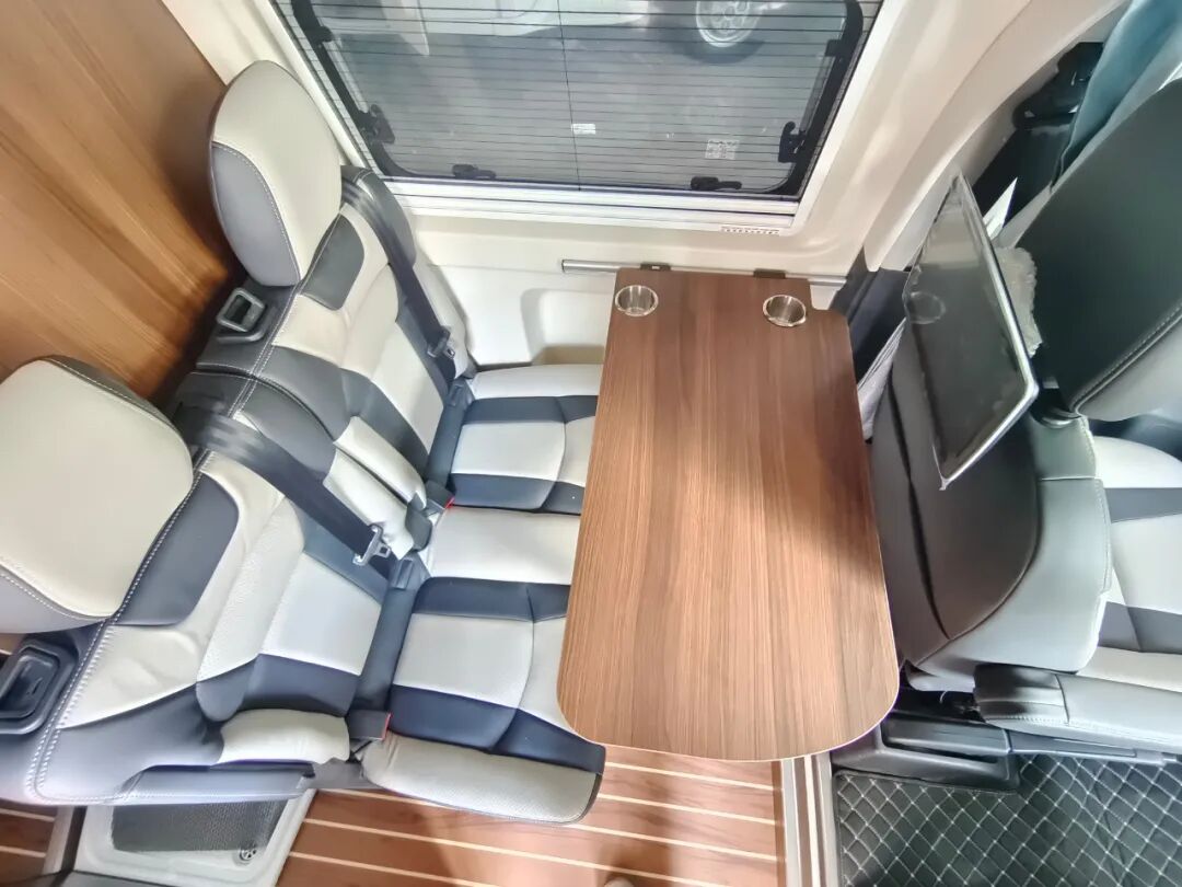 会客区采用了双人座椅+餐桌的组合,座椅都可调节且进行了软包处理,餐桌不仅可以折叠、拓展,还可拆卸下来,解放你的双腿,留出更充足的活动空间;座椅的前方还设有小型电视机,方便旅行途中观影娱乐;上方的储物吊柜提供了丰富的储物空间。