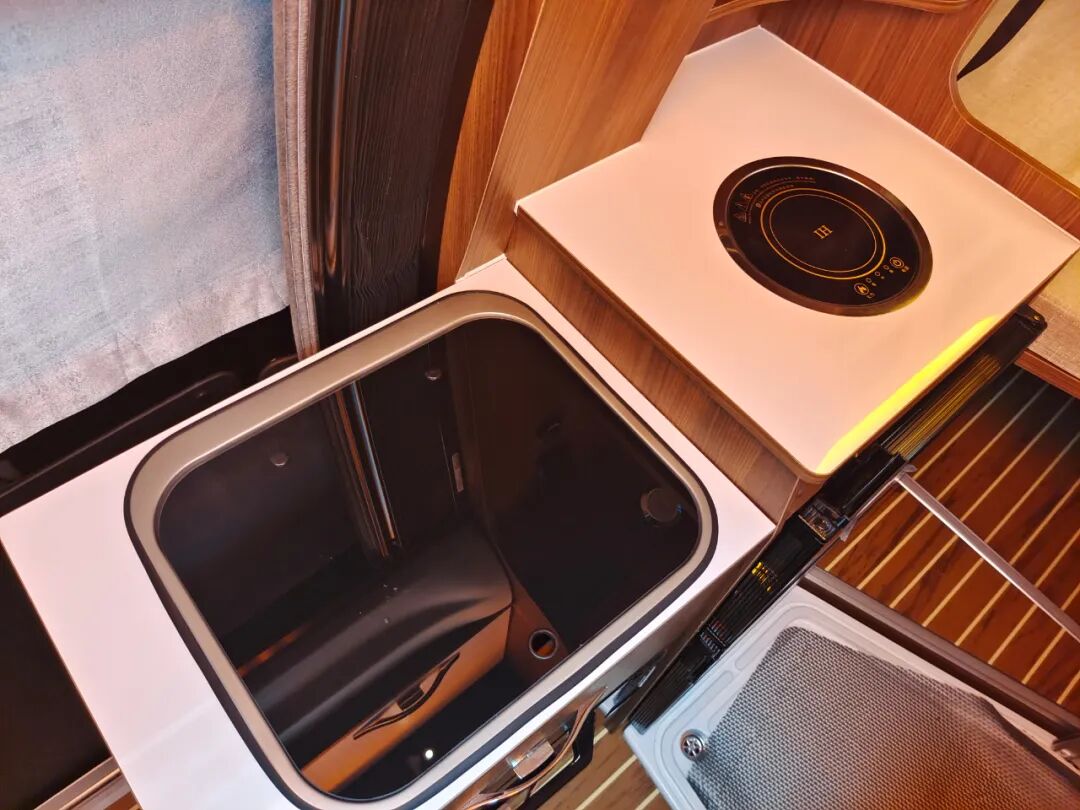 厨房区在会客区的左侧,配置了盖板式水槽、折叠水龙头、电磁炉、85L房车专用冰箱、微波炉、8L保温电热水器、储物柜等,满足简单的烹饪需求。