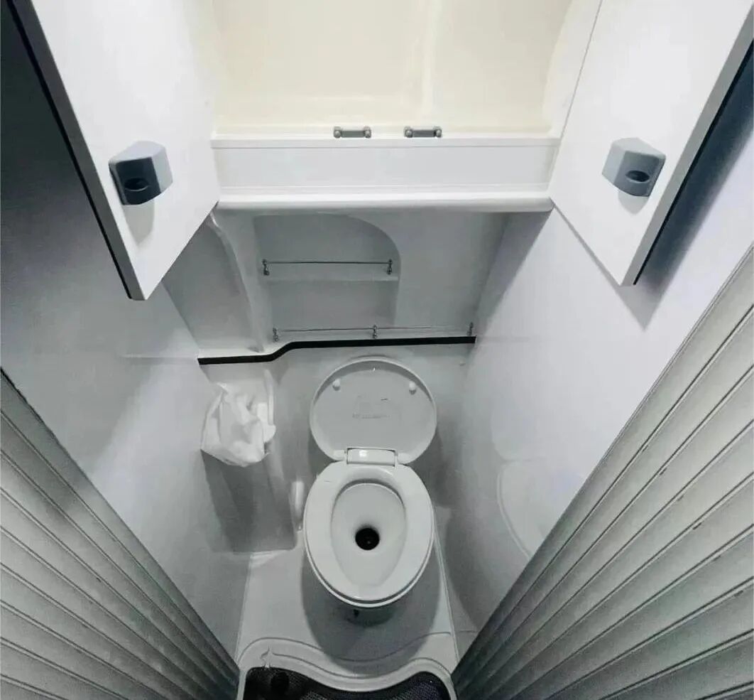 卫浴区在生活区的中部,设计成了卷帘式隐藏卫生间,两侧带有滑行轨道,需要使用时只需拉上就好,这种设计有效提高了空间利用率。里面配备了多功能豪华卫浴系统,包括环保旋转马桶、化妆镜、置物柜、换气扇等,满足日常洗漱需求。