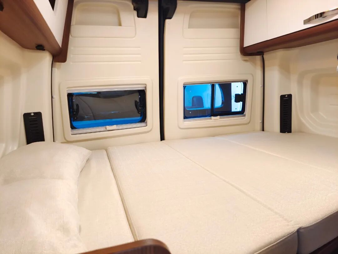 后横床上方设有外推式全景天窗,白天打开后能够加强室内采光、通风;夜晚则可以观看星空,很适合情侣两人居住。