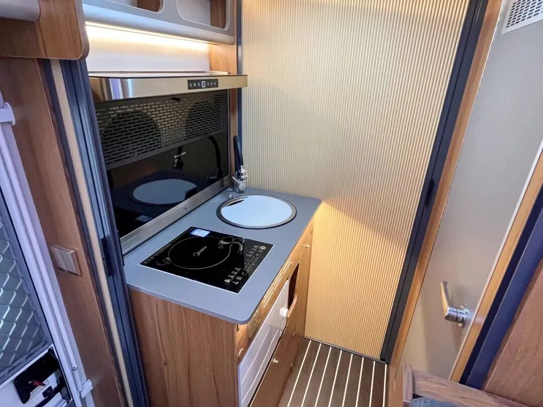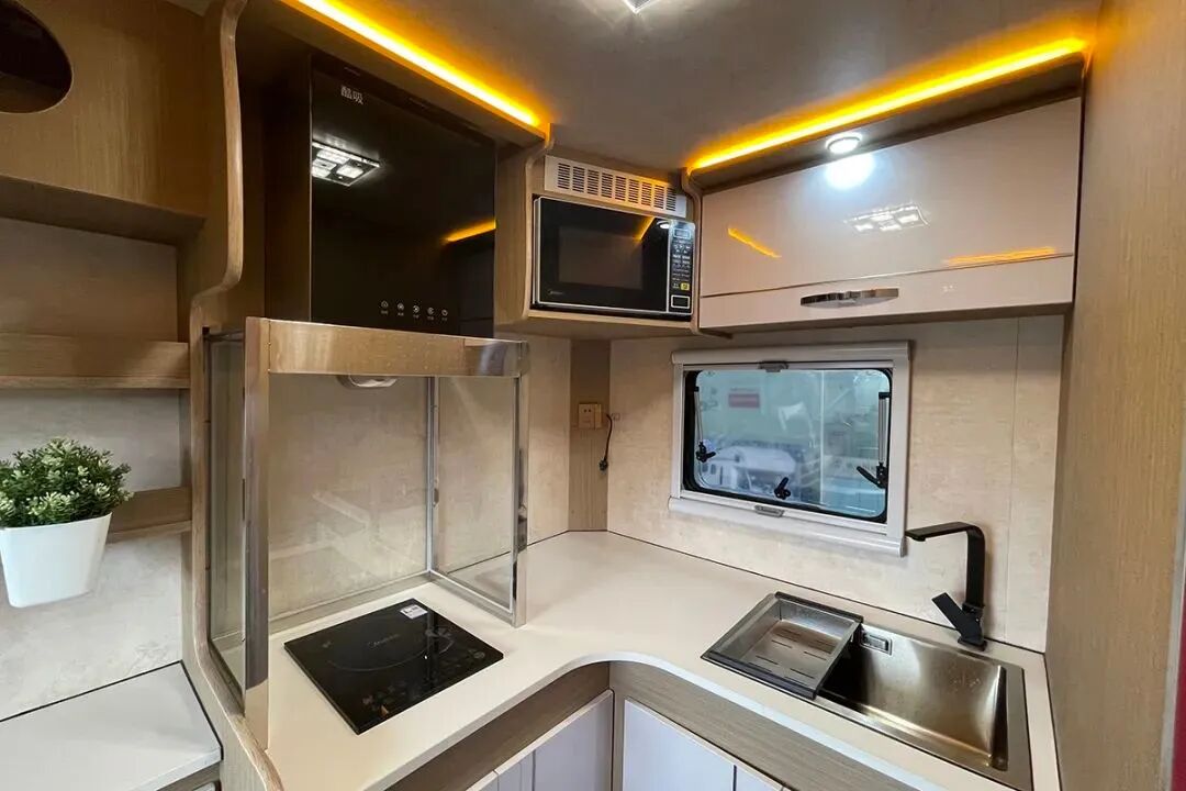 后舱就是厨房区、卫浴区,里面配备了电磁炉、微波炉、抽油烟机、赛特福德马桶、淋浴花洒、固定洗手池这些基础配置均有配备,完全满足用户旅居诉求。