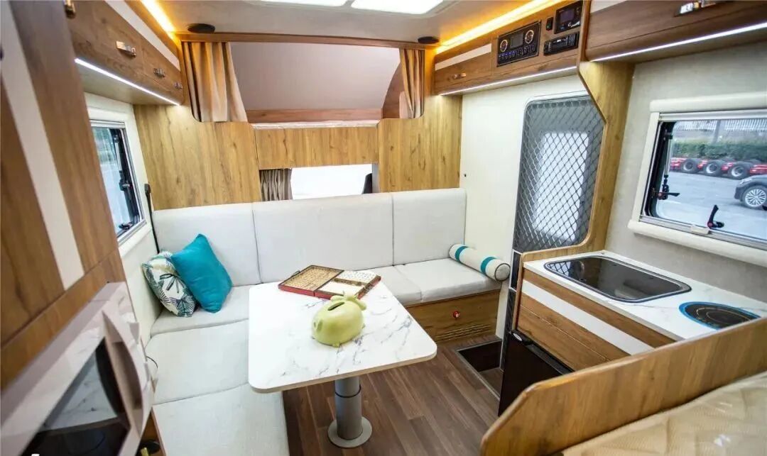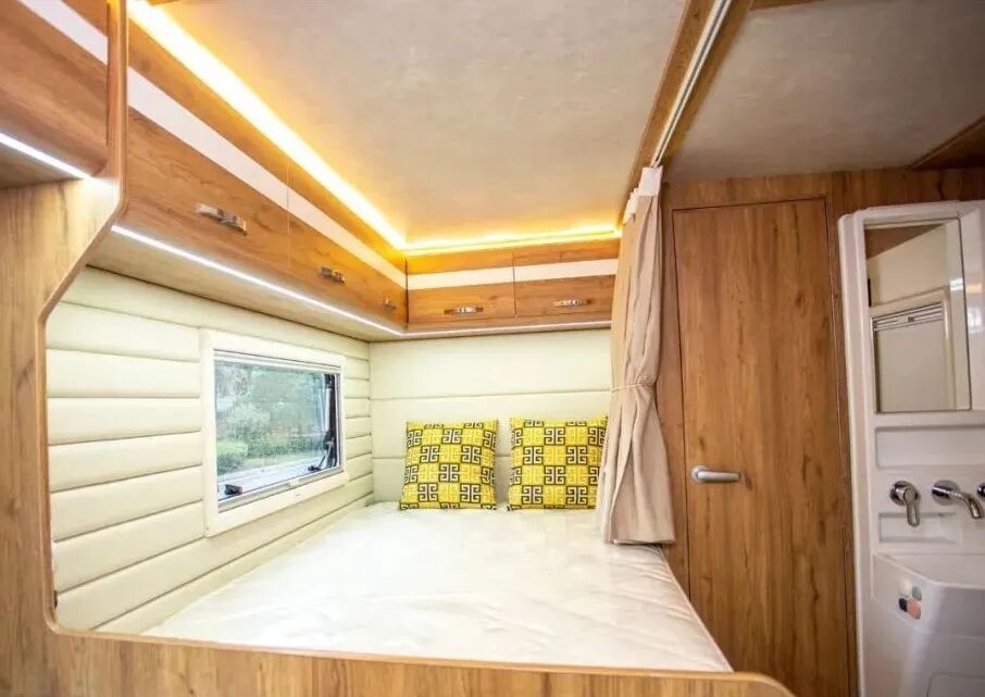 生活区布局与传统布局相似,功能设施配备齐全,内饰选用E0级环保轻量化高光板材和仿木纹地板革搭配,环保无异味,提供安全有品质的生活空间;休息区设有尾置横床、卡座拼床等,可以轻松容纳一家四口旅行休息;生活方面还配备了暖风燃油加热器、热水加热器。