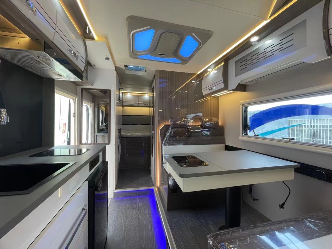 水电系统配备了210L食品级净水箱、65L灰水箱,600Ah锂电、3000W逆变器、1300W太阳能板为房车提供充足的水电支持。