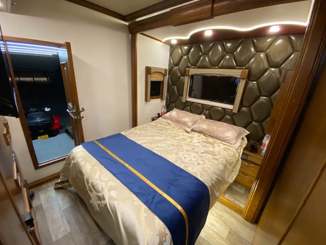 隔断门的设计,方便从车库直接进入车内独立卧室的位置;卧室内部设有进口拓展机构,拓展宽度达到70cm,可在驻车时进一步增大内部空间面积;内部空间表现非常不错,双人大床接近家用的尺寸,并设有美国红橡实木衣帽储物柜、进口房车专用空调、床头无线充电装置两部、储物吊柜、床头柜、照明灯、氛围灯系统等。