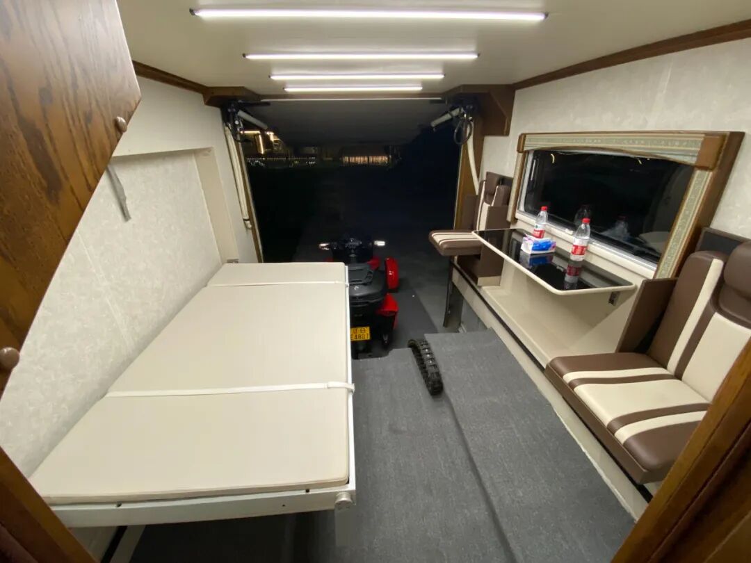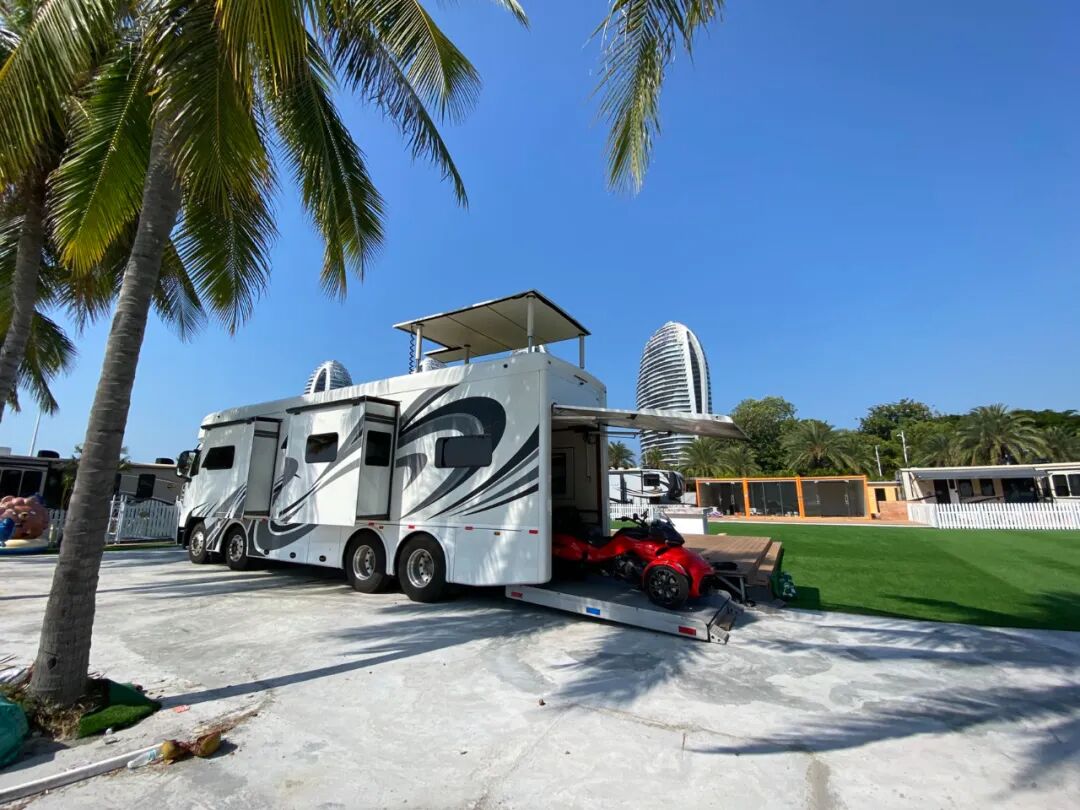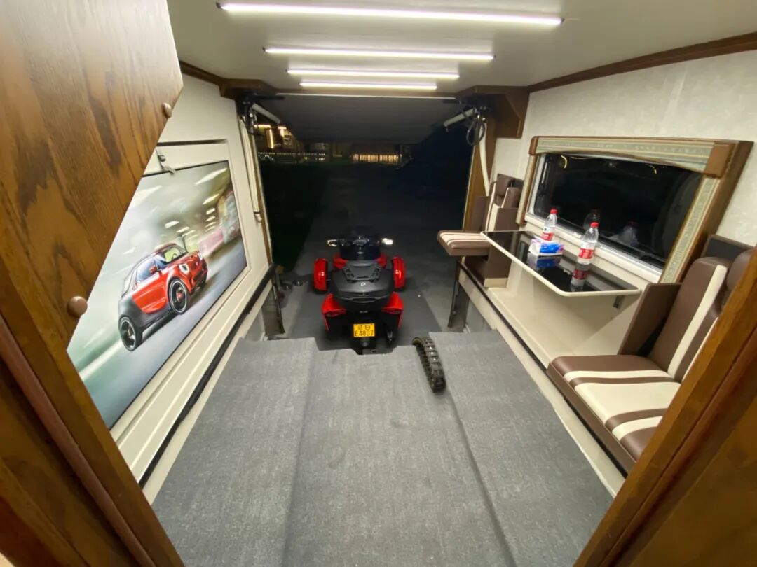 尾部车库配有油压托盘及尾门开关系统,可用于旅行途中装载一辆摩托车、ATV或者Smart之类的紧凑车型,增强旅行驻车时的娱乐性能。