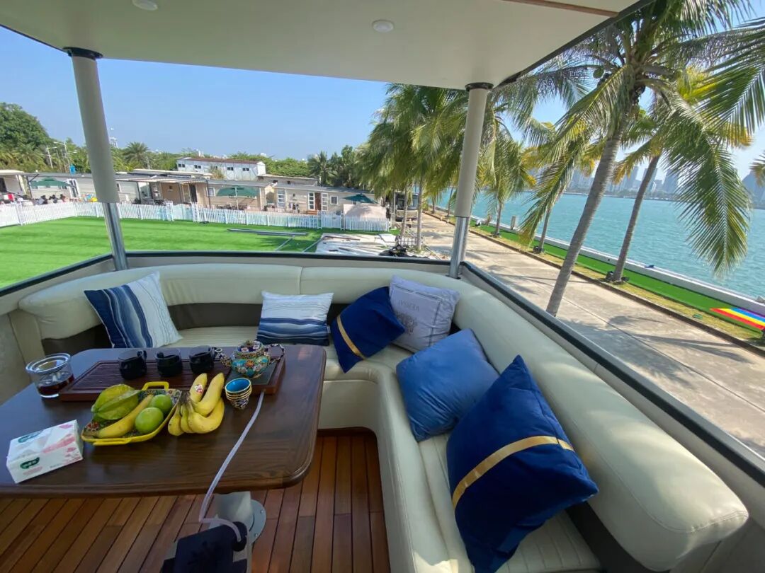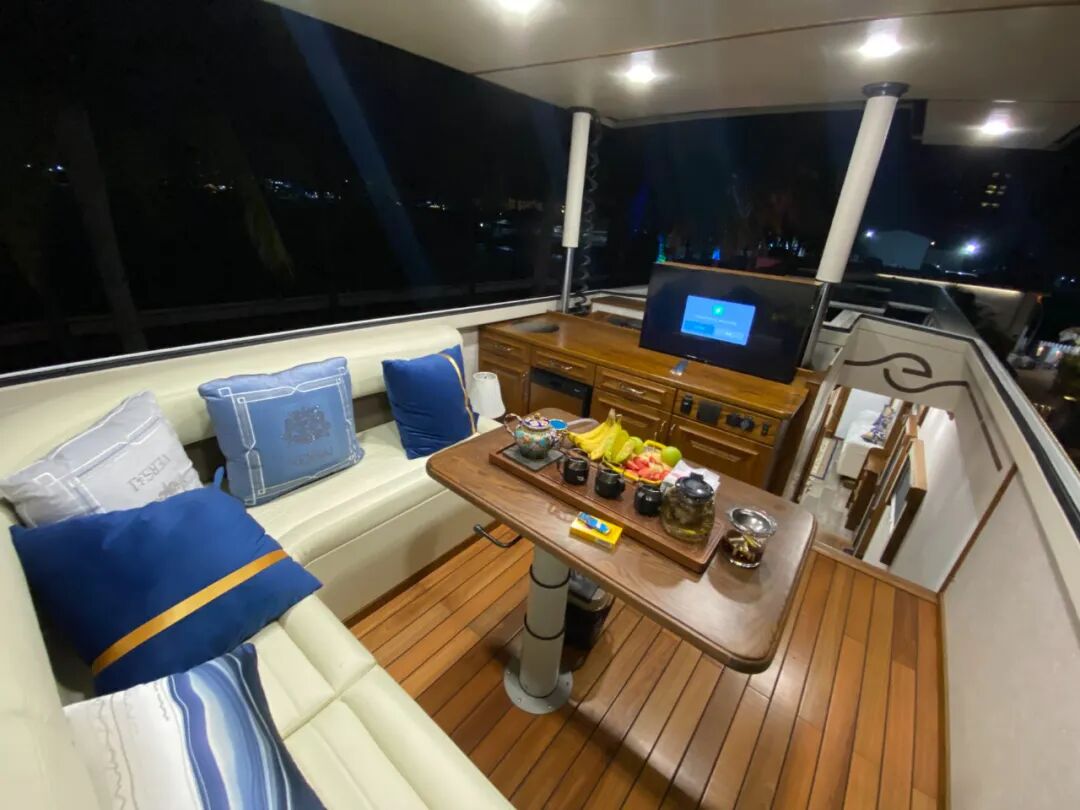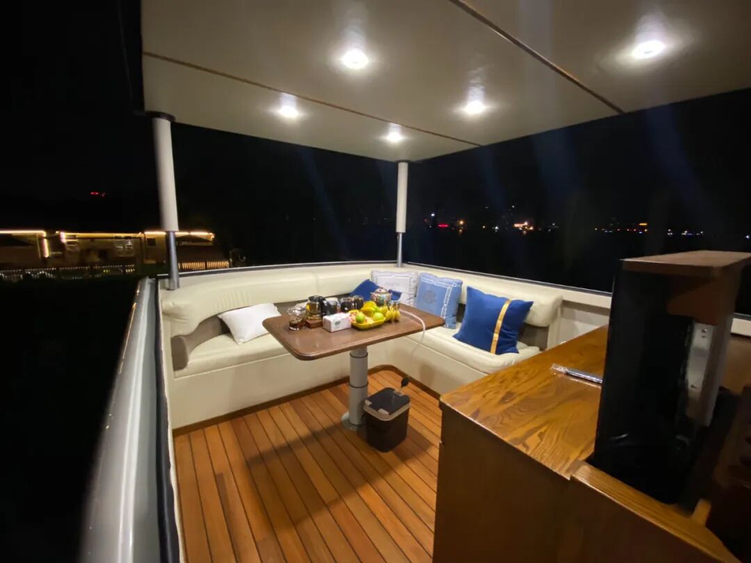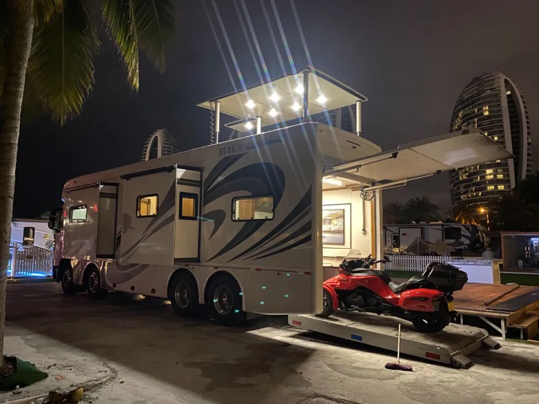 整车另一大亮点,莫过于车顶露台的设计,从通道尽头的阶梯可到达二层,露台采用油压升顶系统,内部配备了真皮L型沙发、可移动餐桌、电动升降32寸电视机、进口49L冰箱、电磁炉等,无论是用于休闲娱乐,还是在这里观赏夜景美景,都能感受到十足的惬意,让你禁不住感叹,生活,本该如此美好。