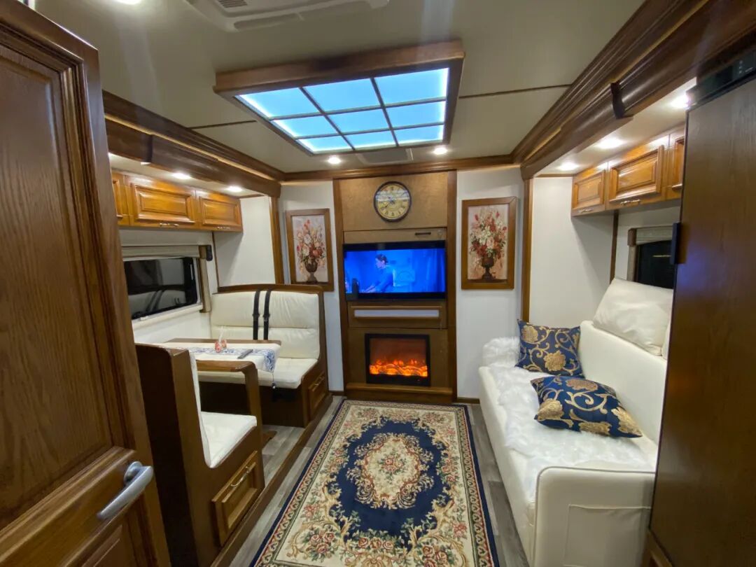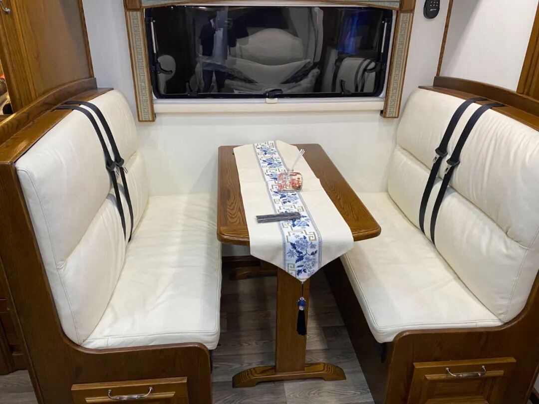 会客区左右两侧分别设有拓展机构,驻车拓展即可获得更通透的空间;内部设有四人对卡座(带安全带)、美国红橡实木餐桌、客厅真皮沙发、43寸智能网络电视、智能咖啡机、收纳柜+鞋柜+红酒柜、内嵌式壁炉、智能小米音响、152L房车专用双开门冰箱、储物吊柜等。