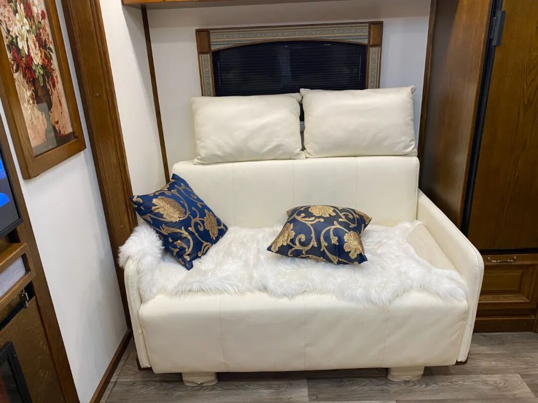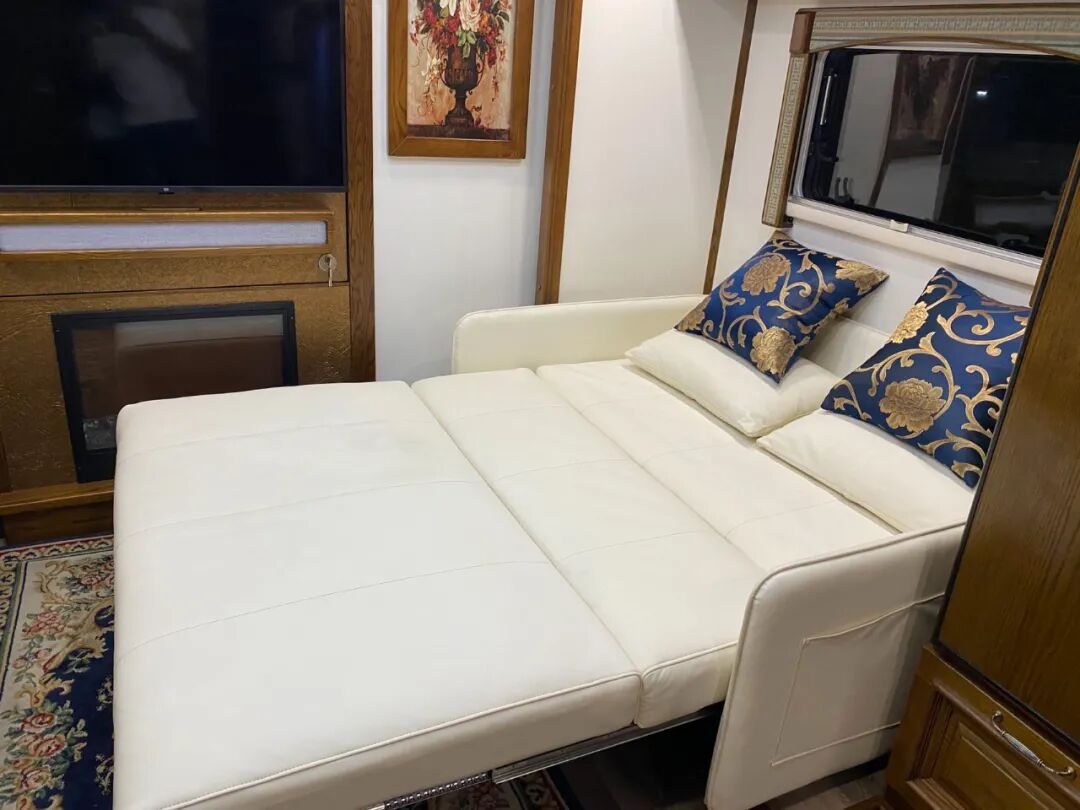 右侧真皮沙发在驻车拓展后,可根据需要转换为一张单人床供临时睡眠使用。
