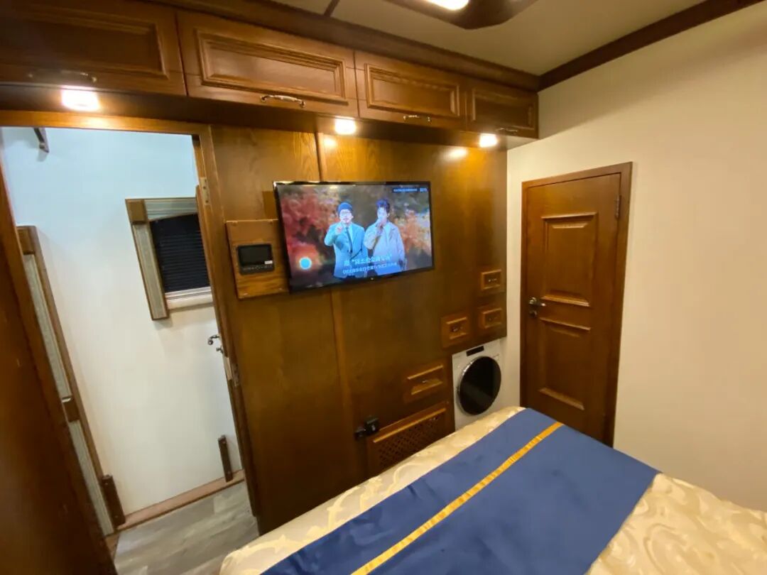床尾临近的墙面上还有32寸小米电视便于休息时观赏影片,下方小吉洗衣机可用于旅行途中清洗衣物所需,解放双手,旅行生活更惬意;卧室采用双门设计,除了直接通往车库的,还有一扇通往车内过道。