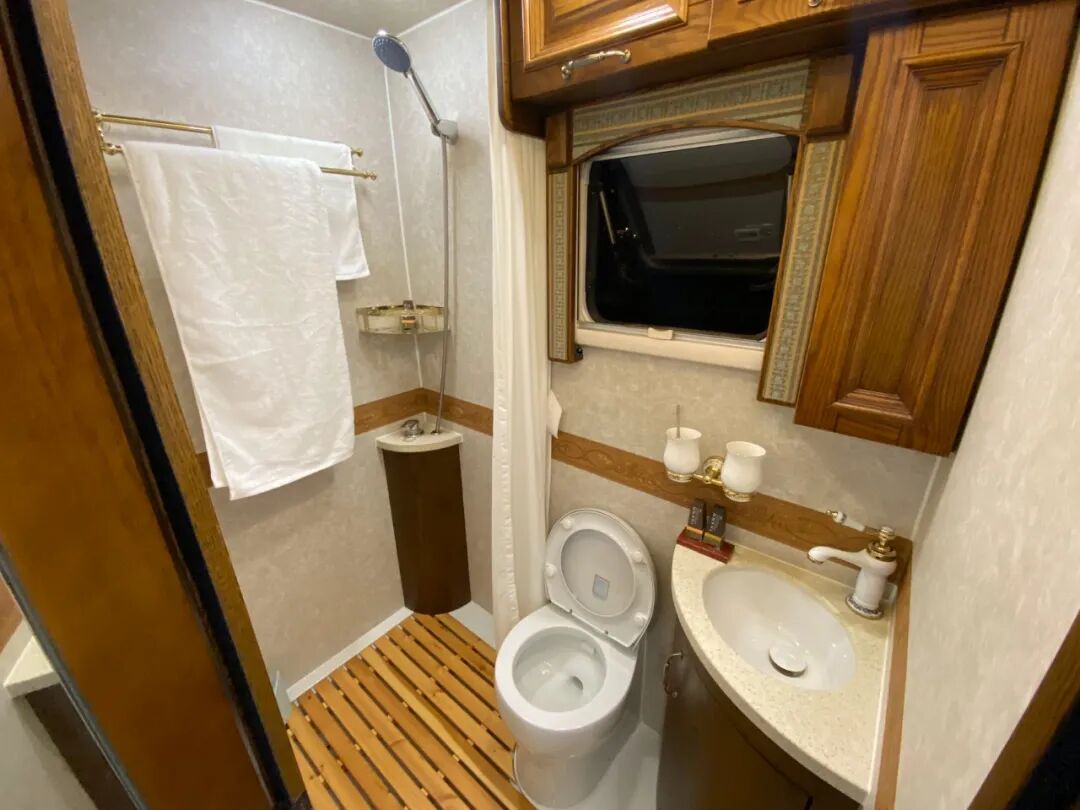 卫浴间位于卧室相邻的位置,内部使用浴帘做了简单的干湿分离处理,空间表现较为宽裕,日常使用会有不错的体验;盥洗设施方面,卫浴间配有可抽拉式淋浴花洒、进口房车专用坐便器、全瓷洗漱池、房车专用特鲁玛双能源热水器、沥水板、毛巾架、储物柜等,满足旅居生活卫生、洗漱的需求。