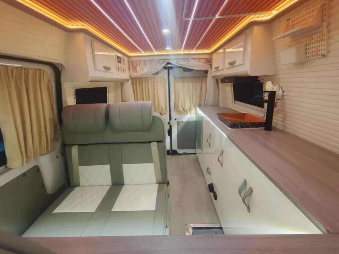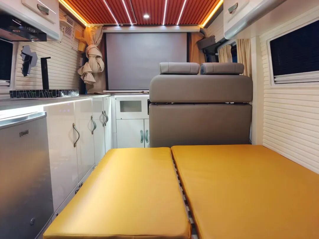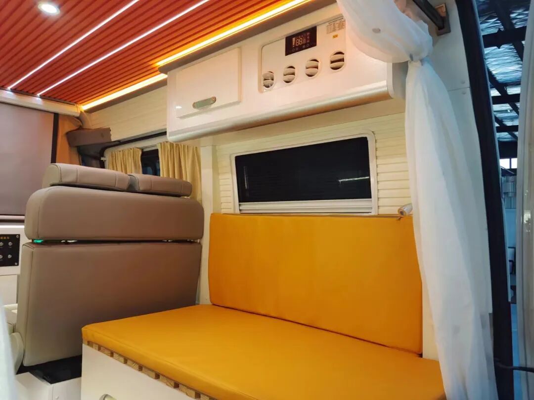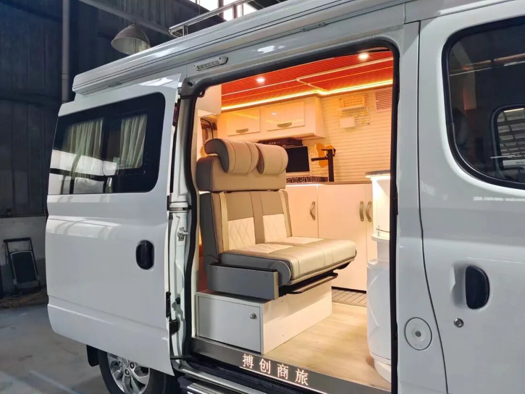 双人座椅后排还有一张可拓展纵置沙发(行车不可载人),除用于驻车休闲以外,还可拓展变形为床,供两人临时睡眠所需;从床位来看,虽然这款车可以实现核载5人,但从睡眠的角度来说,还是比较适合两人出行。