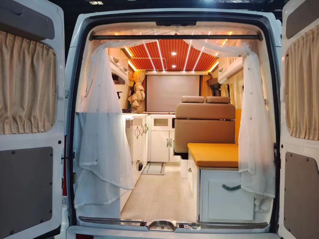 另一个进客门在车尾部分,对向双开门设计,搭配隐私帘,可在驻车休息时对车内起到很好的通风效果。