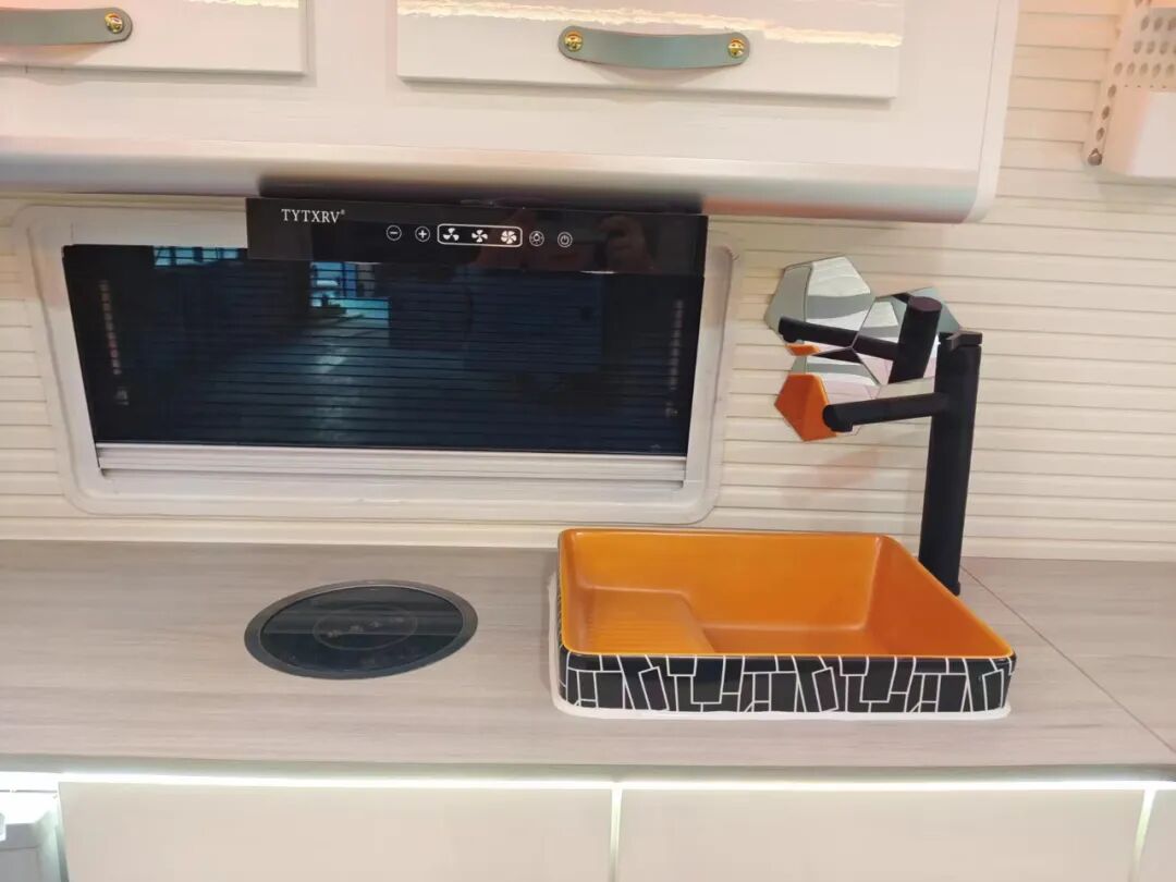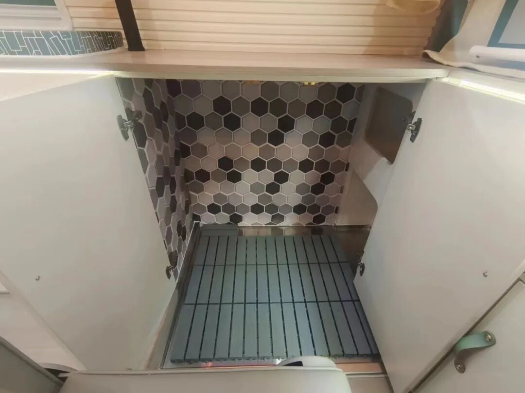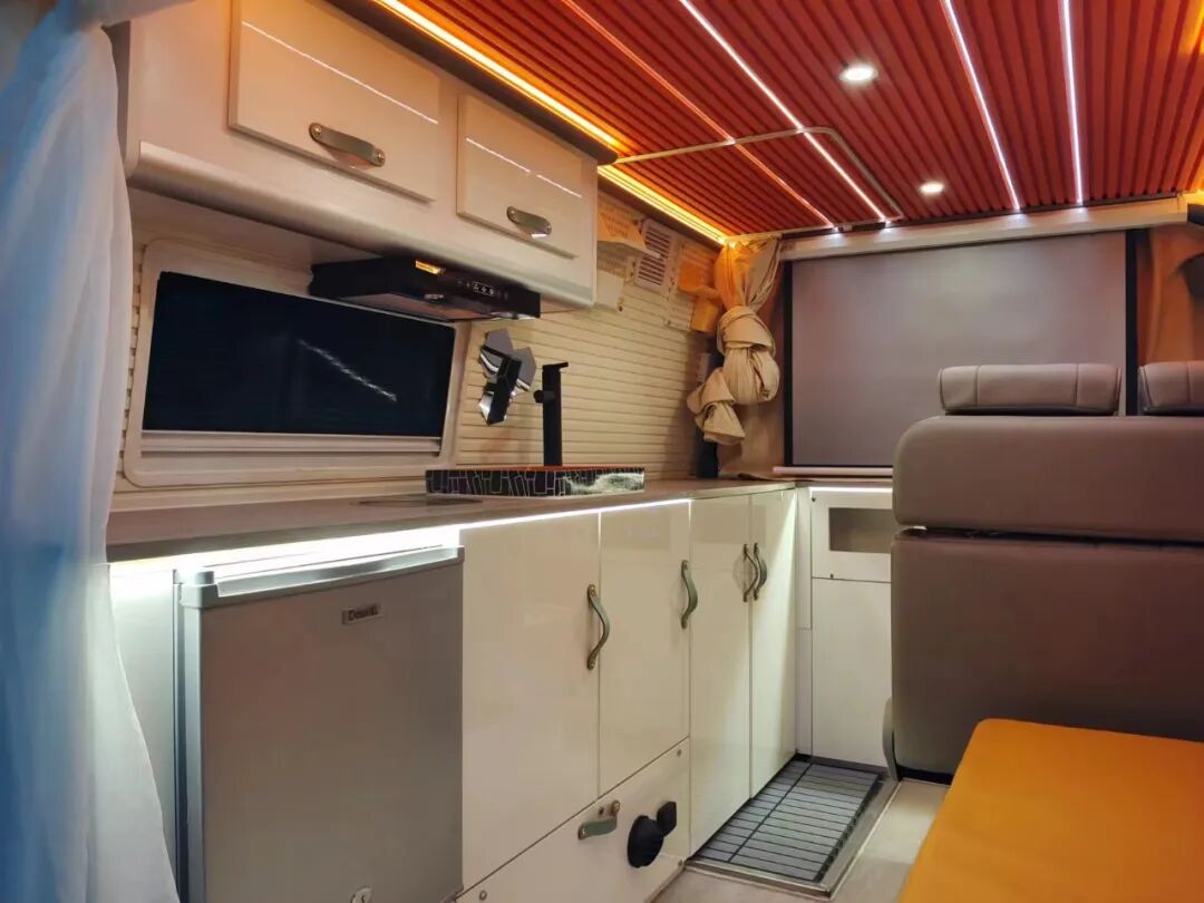从尾门进入生活区,左侧便是车内厨房的位置,近乎占据整个侧面的操作台,搭配电磁炉、抽油烟机、洗菜池、水龙头、储物柜、储物吊柜、50L车载冰箱、抽拉式燃油灶等设施,基本可以完成日常烹饪饮食的需求。