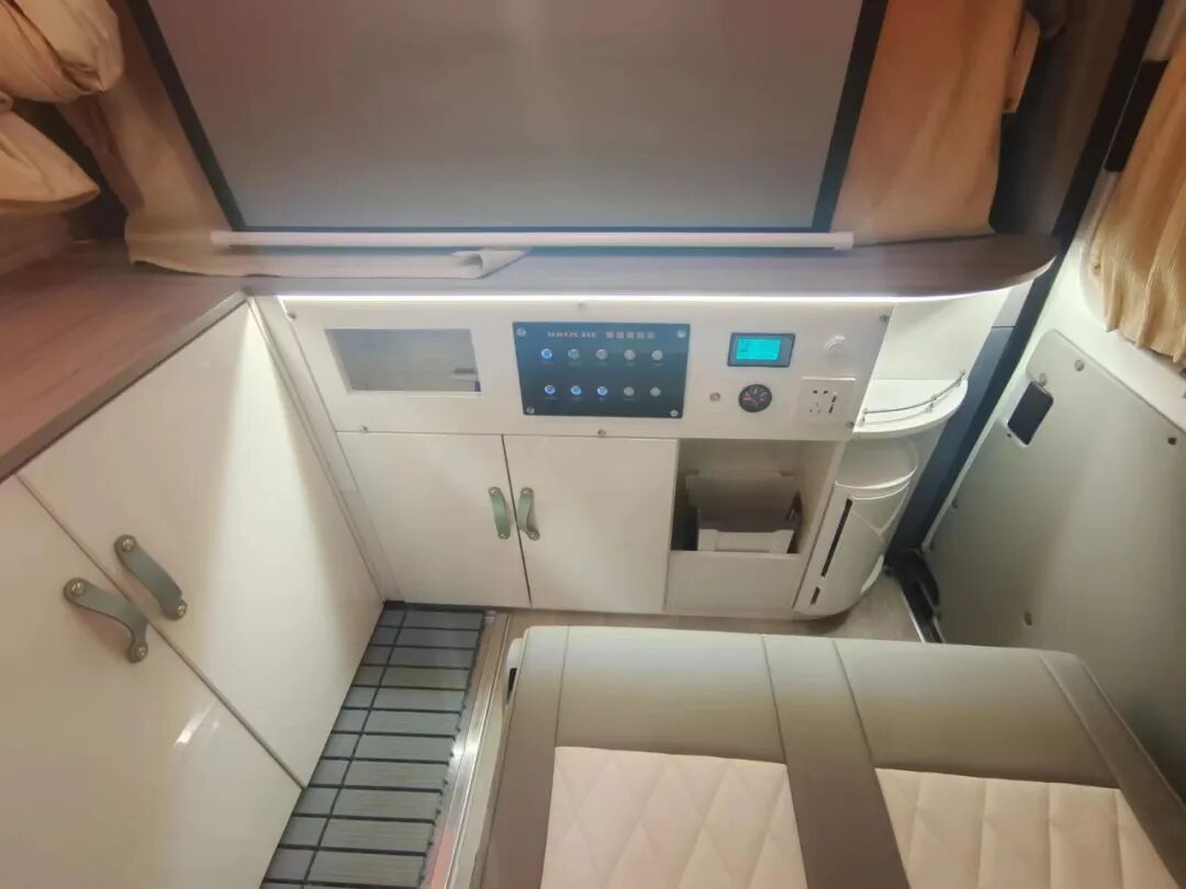 尽管车内空间有限,但这款车的生活区依然设计了隐藏式卫生间,位于双人座椅侧方的操作台下方,虽然相较常见房车的卫浴间略显简陋,但搭配便携式马桶,也足以满足临时应急所需。