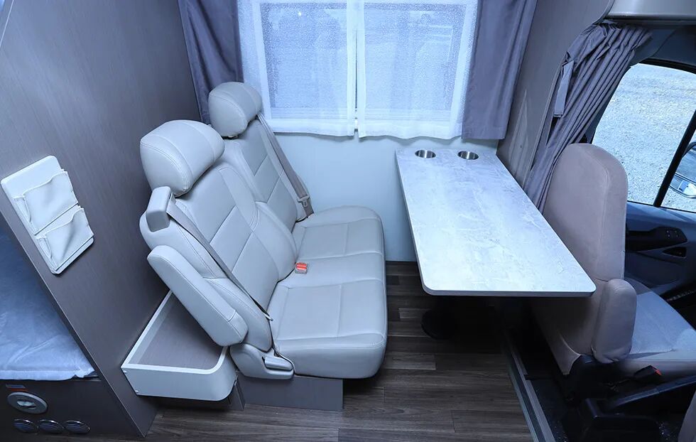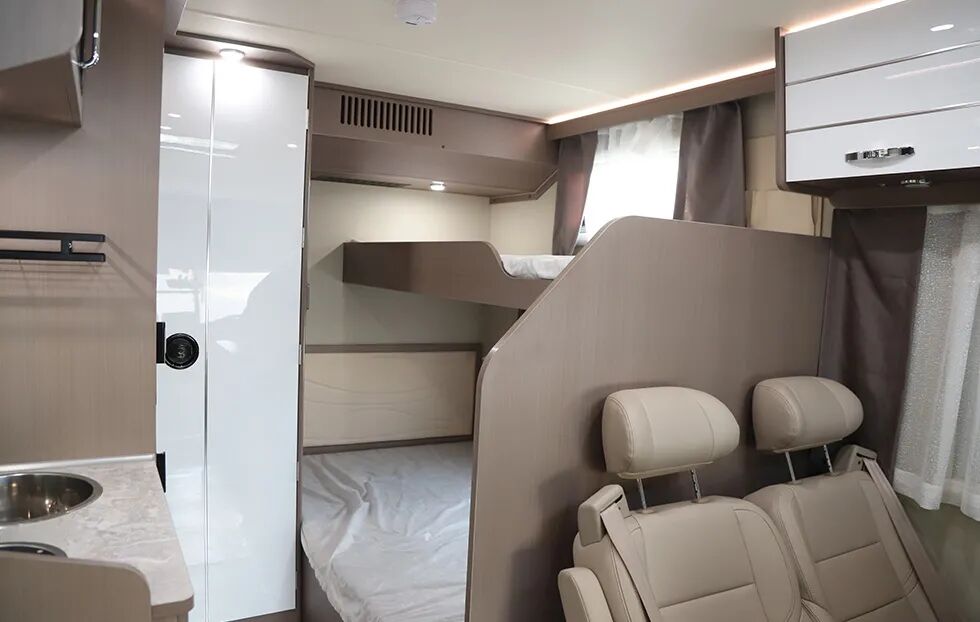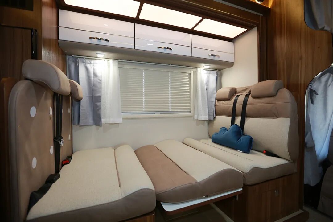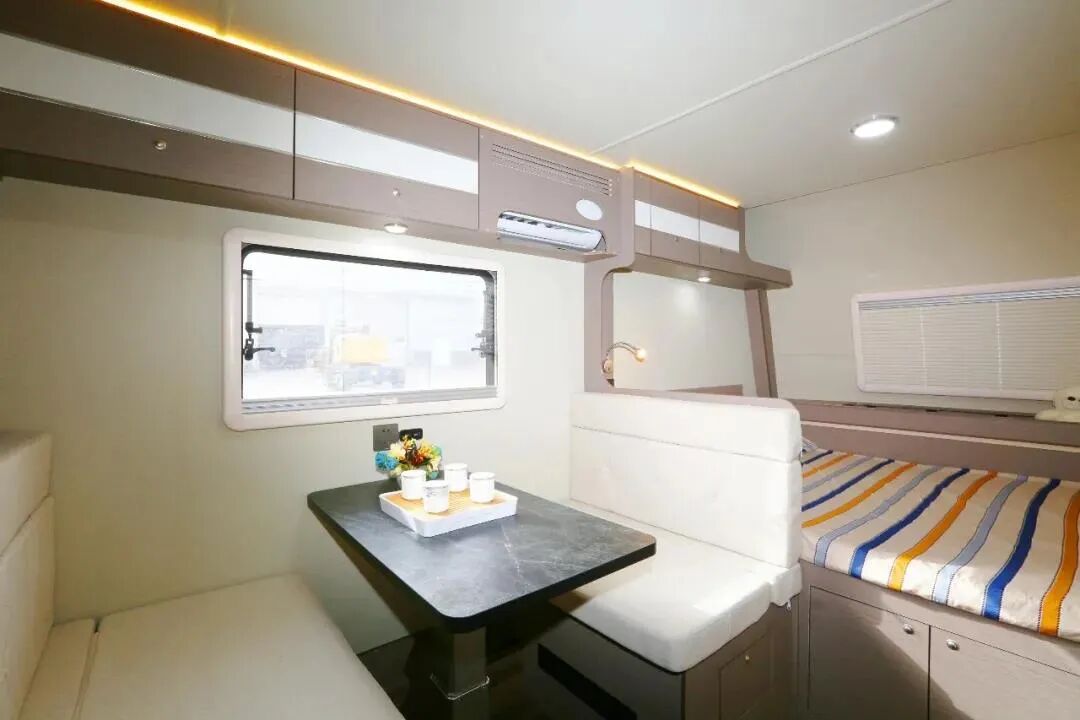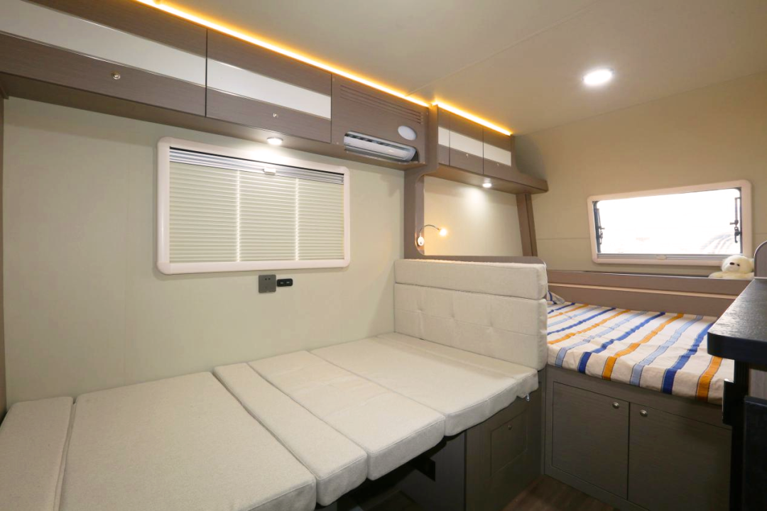 风华内饰风格,仿实木地板革尽享品味格调,额头双人床+尾部纵置子母床,可容纳多人夜间睡眠;会客区双人座椅并配有餐桌;