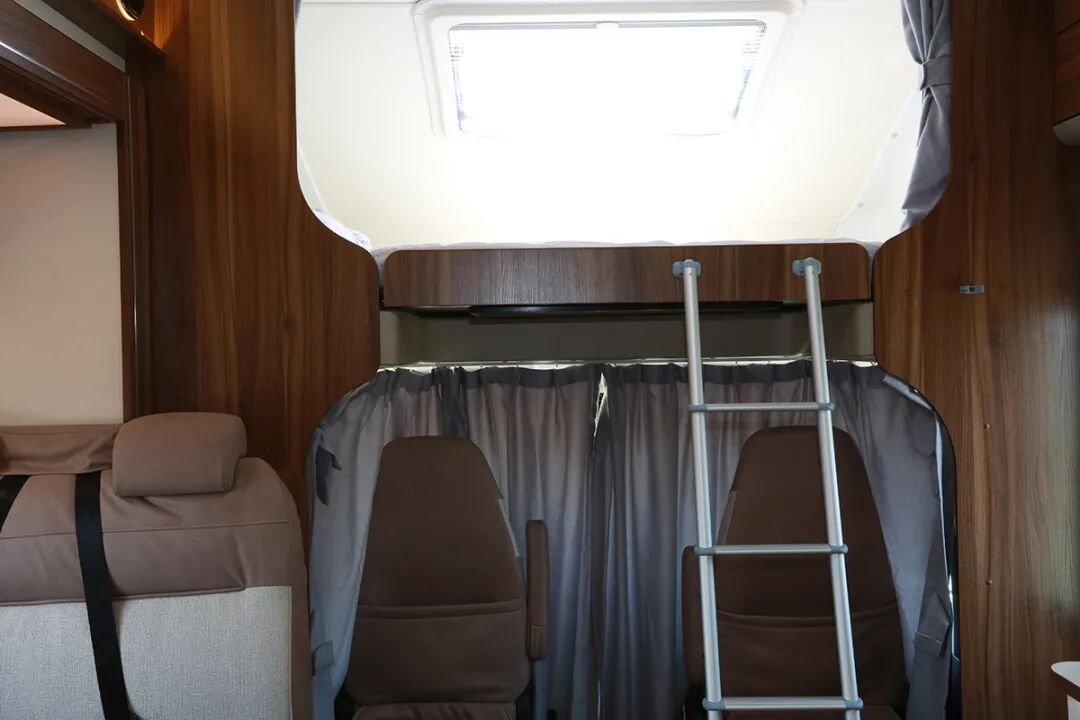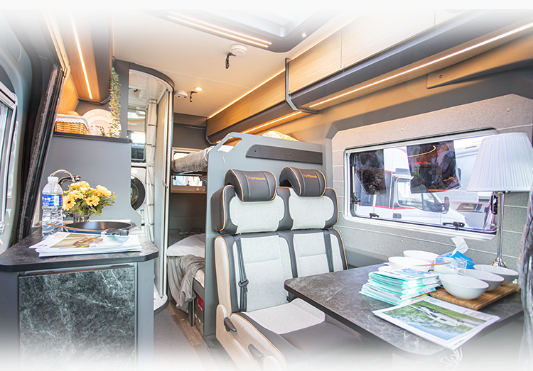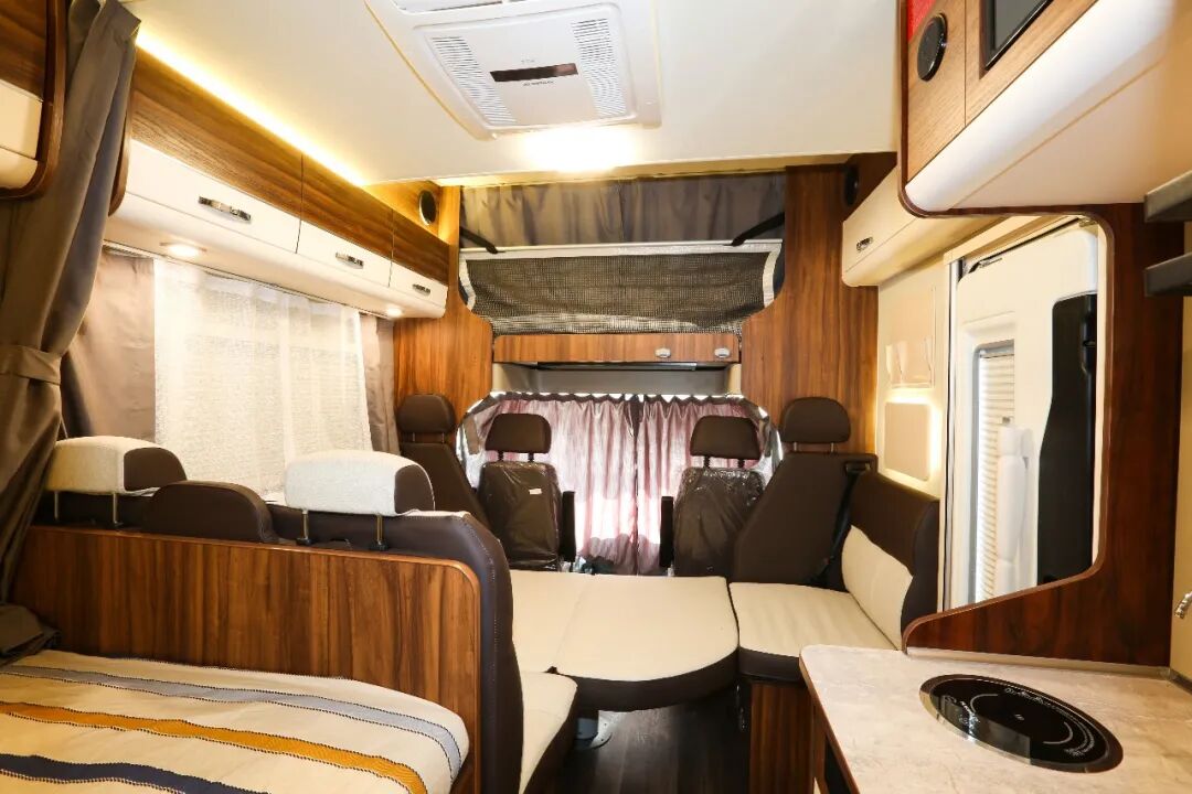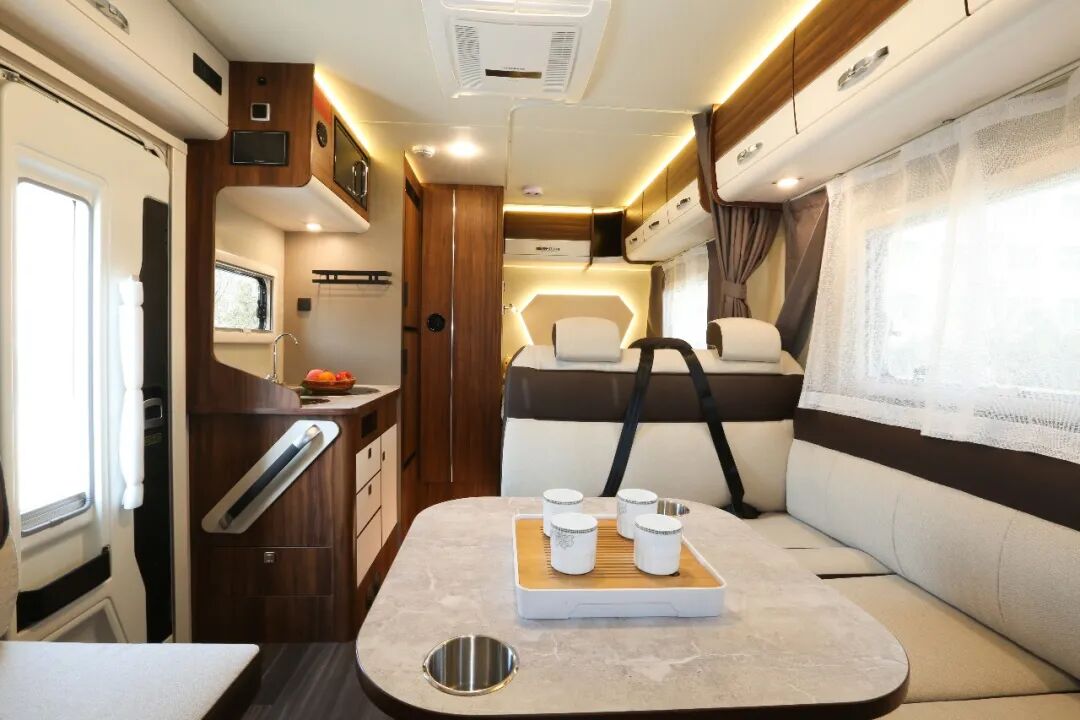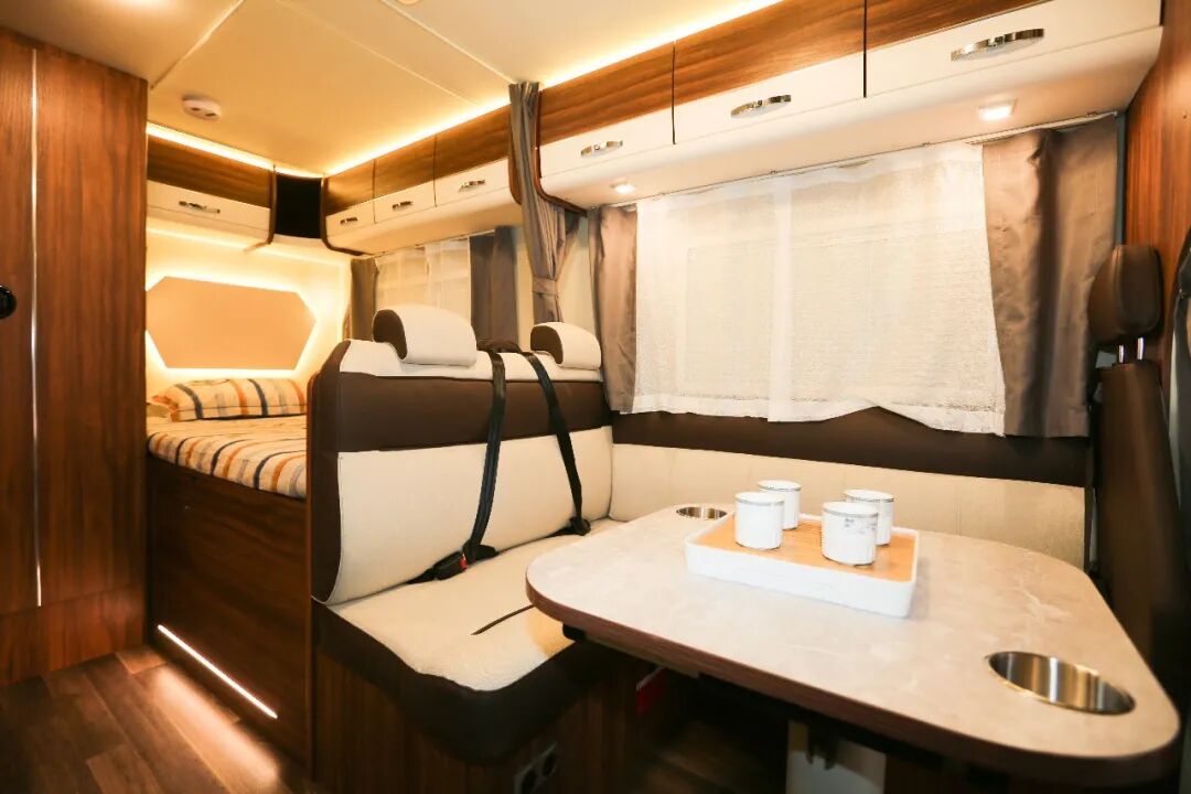 风华内饰风格,仿实木地板革尽享品味格调,额头双人床+尾部纵置子母床,可容纳多人夜间睡眠;会客区双人座椅并配有餐桌;