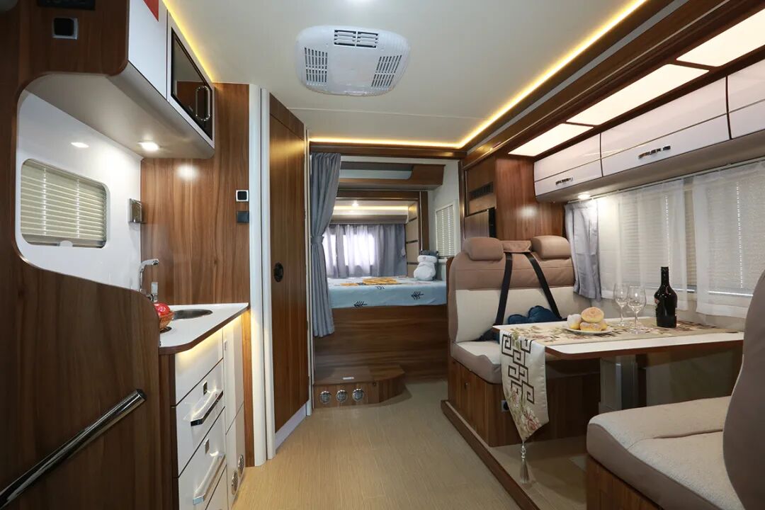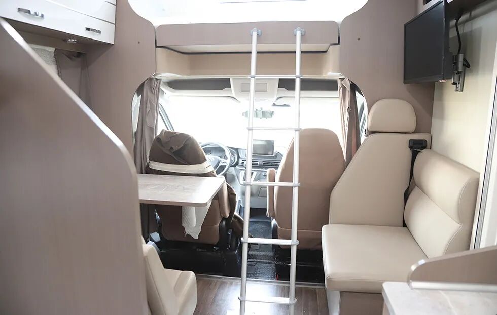 国产依维柯底盘,3.0T柴油发动机,8速自动变速箱;环形卡座带有气动升降式餐桌(四向滑移),额头双人床+尾部纵置双人床(可选子母床),休闲娱乐、休息睡眠全部满足;