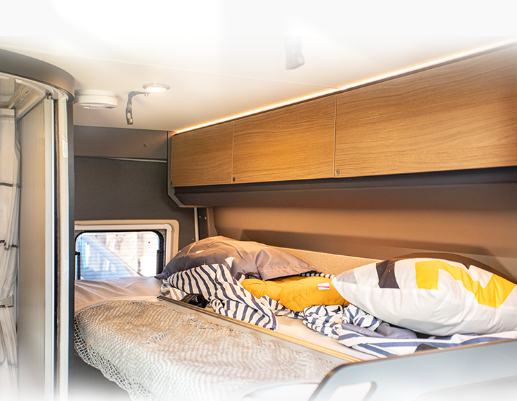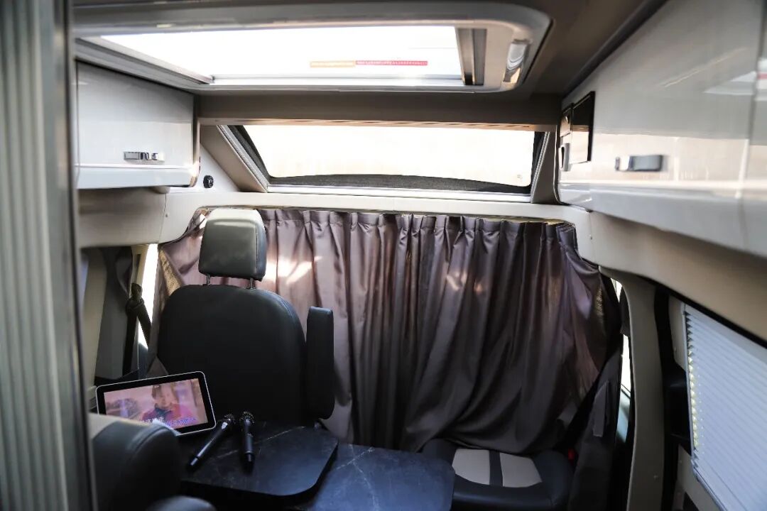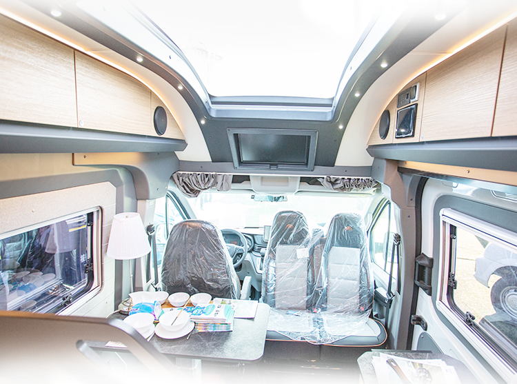 前部弧度全景玻璃天窗、乘客区天窗、睡卧区天窗三天窗设计;