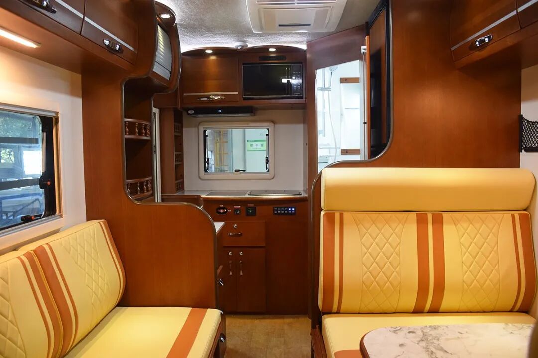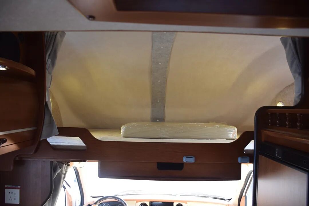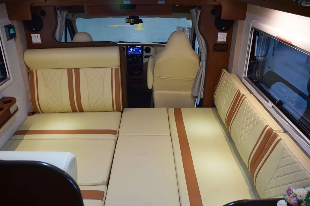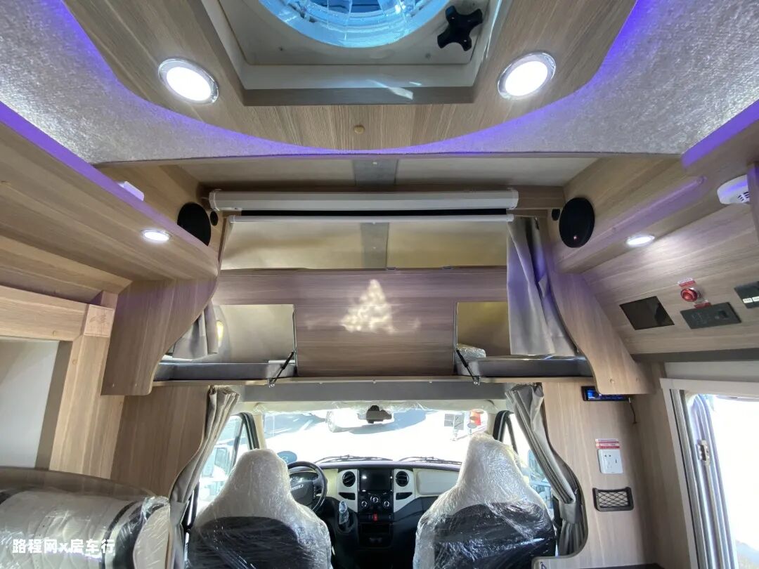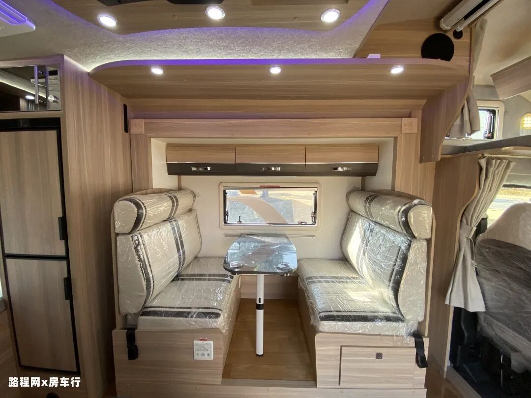 额头内置双人床,侧面长条沙发+对向卡座可拼大床,睡眠空间充足;大尺寸外推窗;