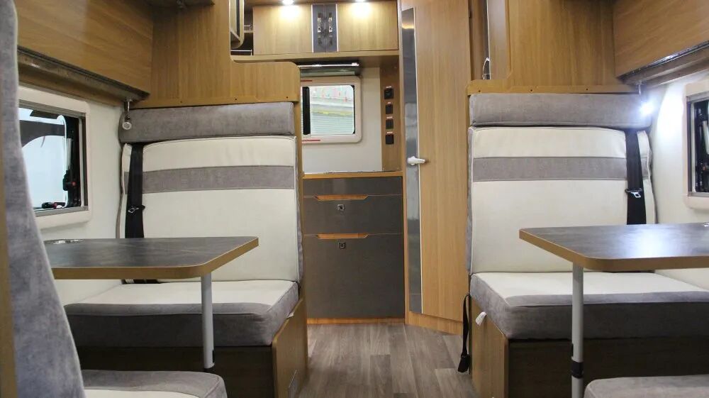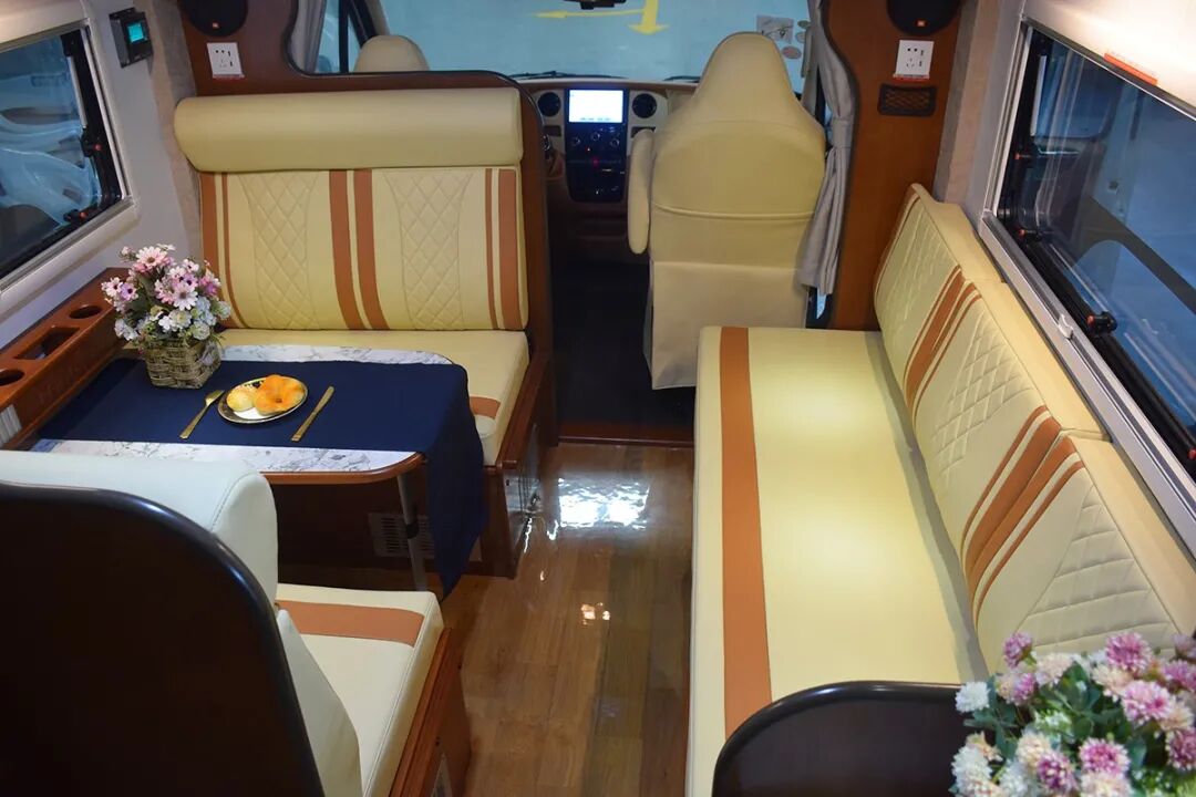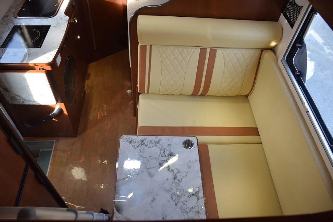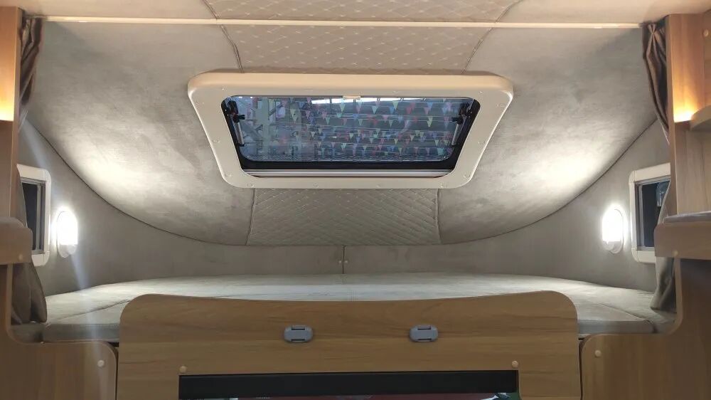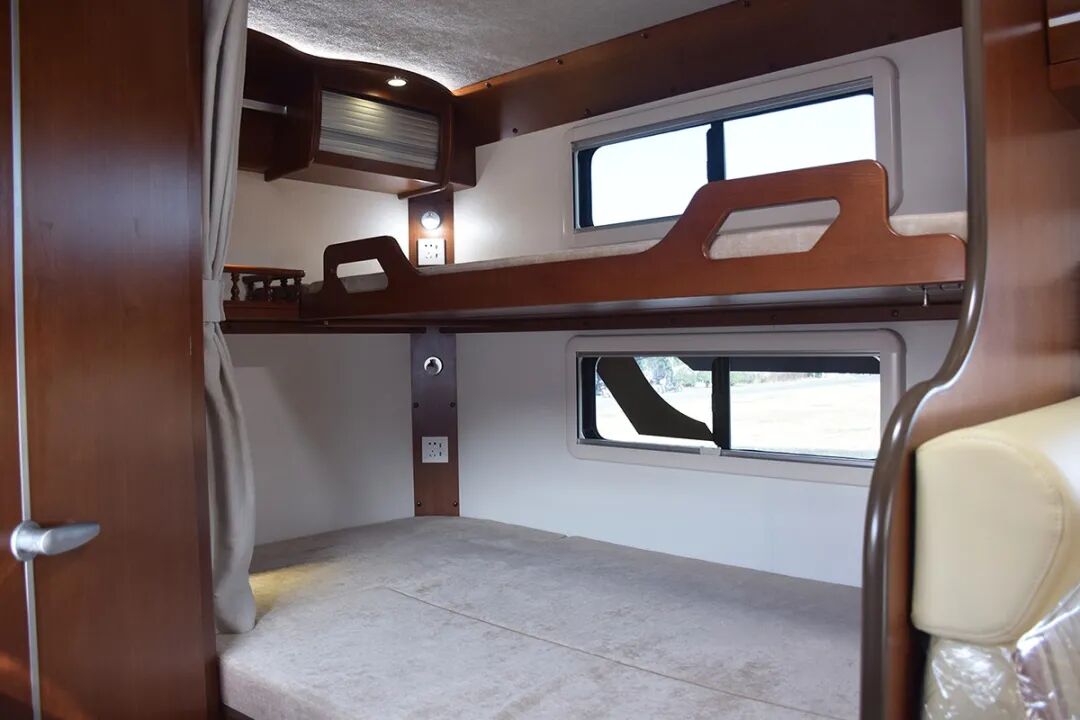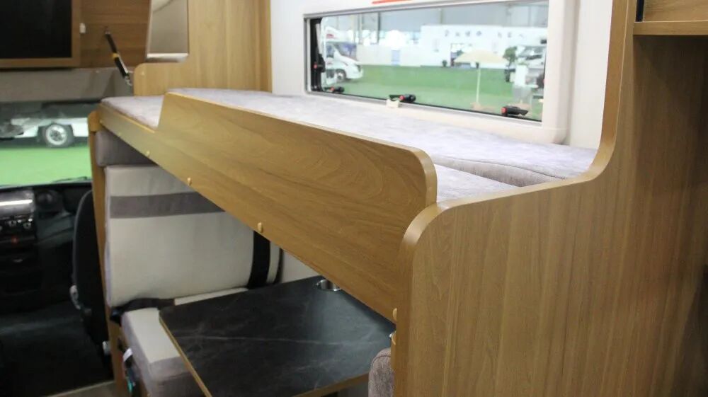 额头内置双人床,侧面长条沙发+对向卡座可拼大床,睡眠空间充足;大尺寸外推窗;