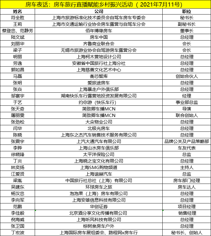 本次夜话会邀请了房车露营行业内的多位领导嘉宾莅临现场,共同为乡村振兴赋能,促进、推动房车旅行带动乡村振兴快速发展,共谋发展新思路!