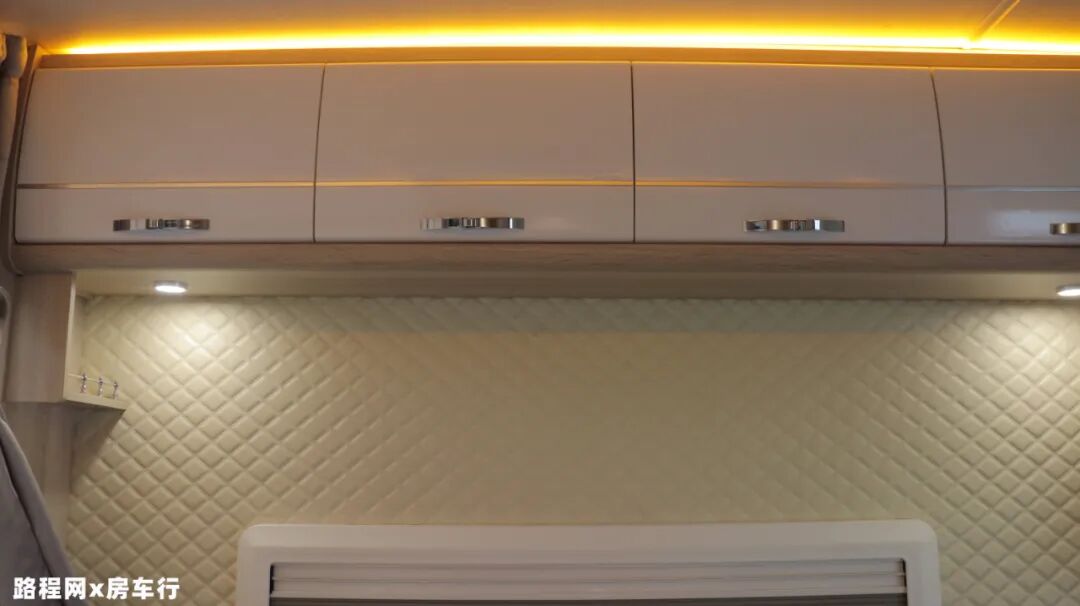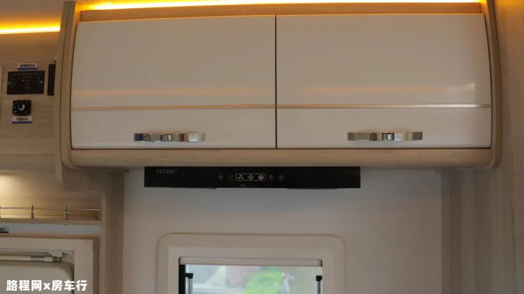 一体式橱柜上方设有车载吸油烟机,有效减少车内做饭时产生的油烟味;顶部则是两个储物吊柜方便放置物品;