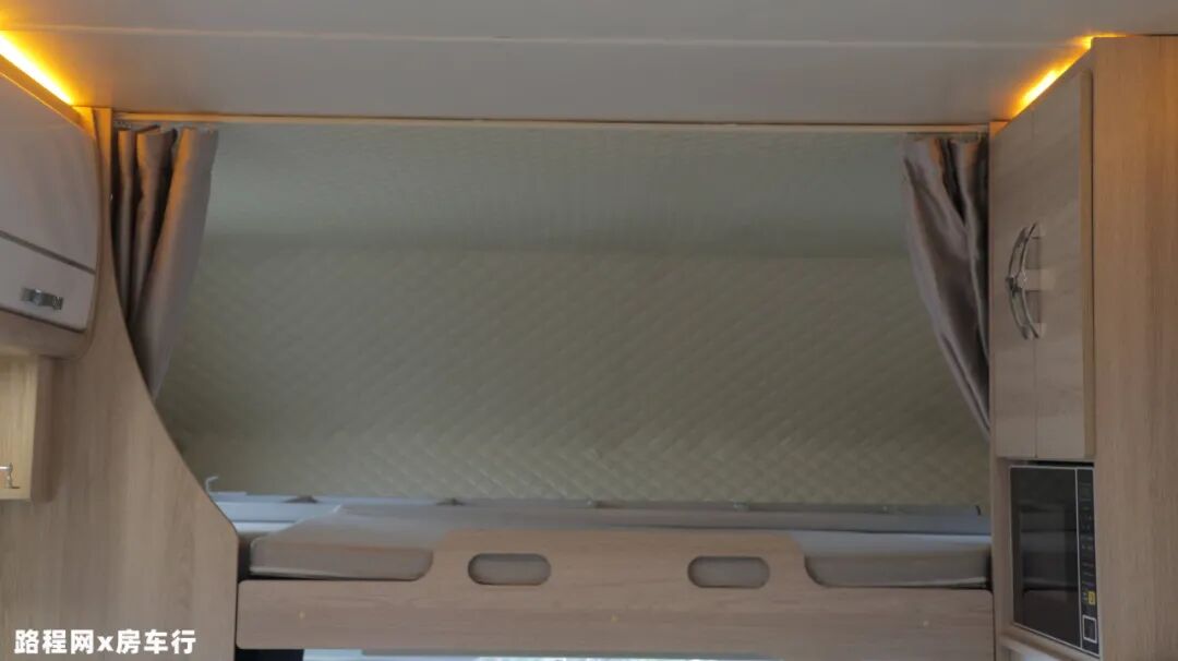 驻车休息时将电视盖上即可变为休息区,额头处内置一张双人床,铺设高密度海绵床垫带来舒适的睡眠体验,内部空间也非常的宽裕,满足多人休息睡眠的需求;额头床两侧设有外推窗加强内部的采光、通风;床侧设有窗帘可用于保护内部人员隐私,私密性有保障;