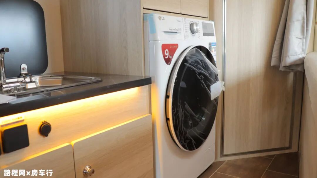 与厨房紧挨着的位置搭载了一台7KG洗烘干一体的洗衣机,方便日常清洗衣物,解放双手,大件、小件都能用;洗衣机上方设有衣柜,尺寸面积够大,充分满足日常旅行放置衣服的需求;