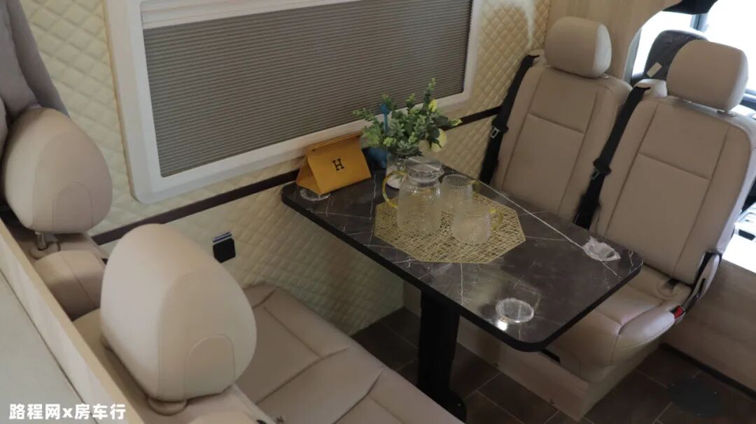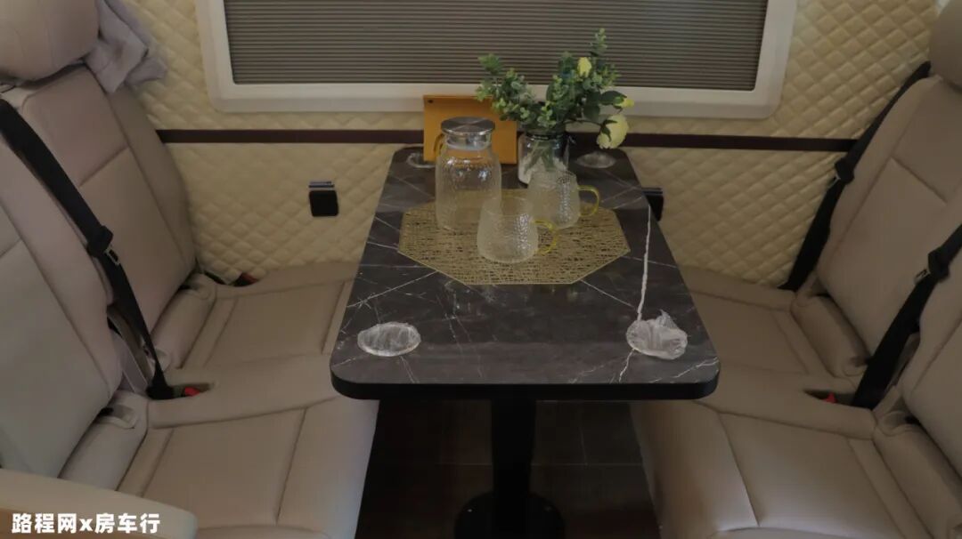 会客区位于车内左侧,设有四人对坐卡座,配有安全带方便行车中载人;中间则是一张可升降餐桌(四角带有杯托)方便车上人员日常休闲、娱乐、餐饮使用;侧方设有大尺寸外推窗加强内部采光、通风;