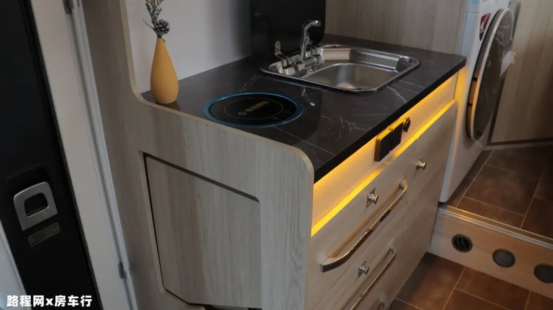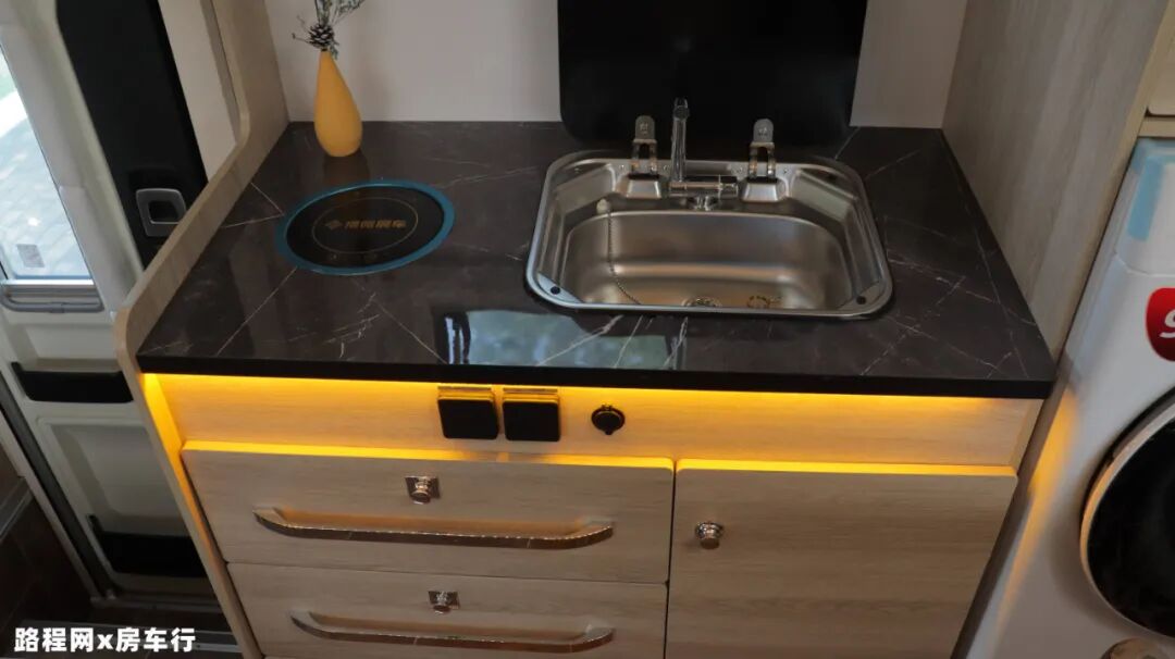 橱柜侧方设有折叠操作台,驻车展开,操作空间进一步增加,也可当做置物台使用;橱柜内配置了嵌入式电磁炉、带盖板的洗菜池、抽屉、储物柜、插座等设施,让你在天气不好时也可以在车内烹饪;