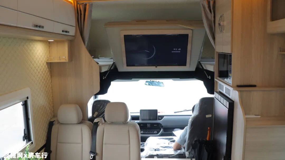 驾驶舱上方搭载一台32寸小米网络电视,提升驻车休闲时的娱乐性,搭配音响系统,影音娱乐方面会有不错的体验;