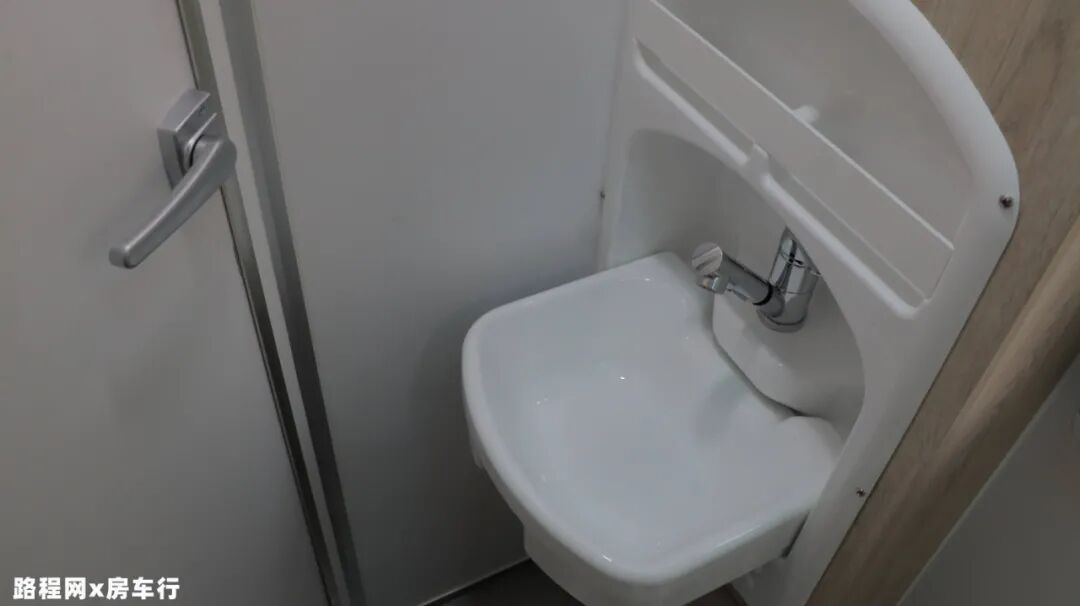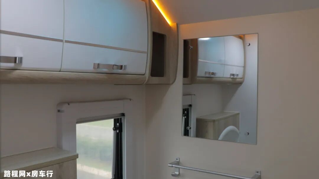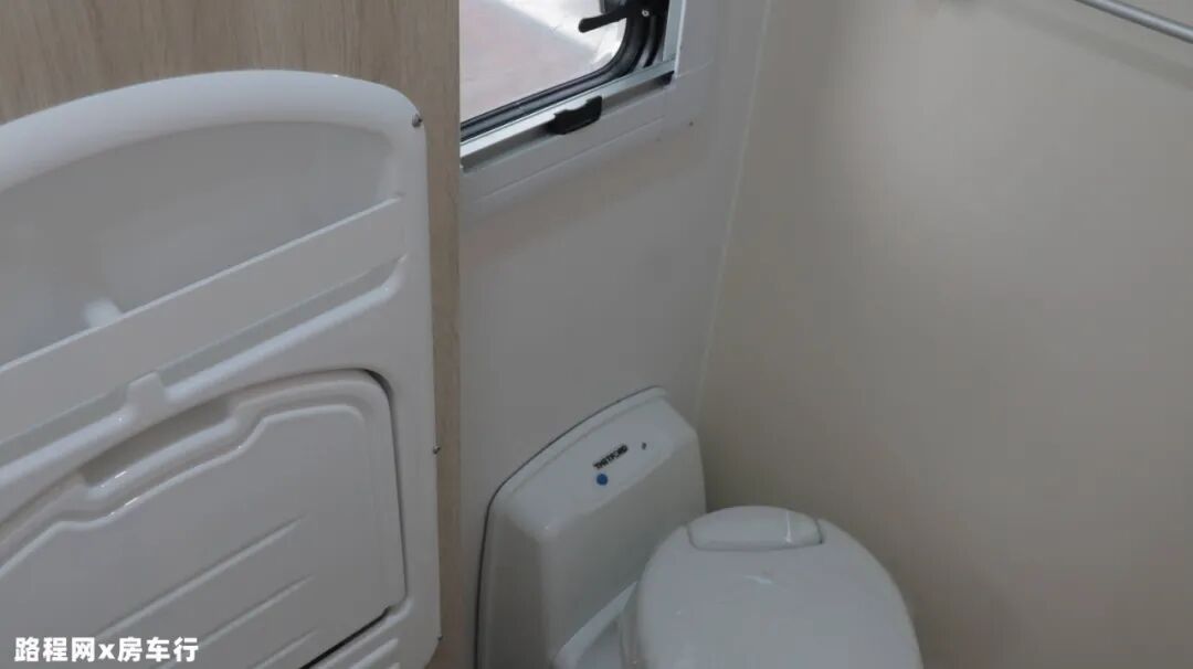 一体式卫浴间内部设有赛特福德盒式马桶、浴镜、外推窗、储物吊柜、毛巾架、淋浴花洒、顶置双向换气扇等设施,满足车上人员卫浴使用所需;