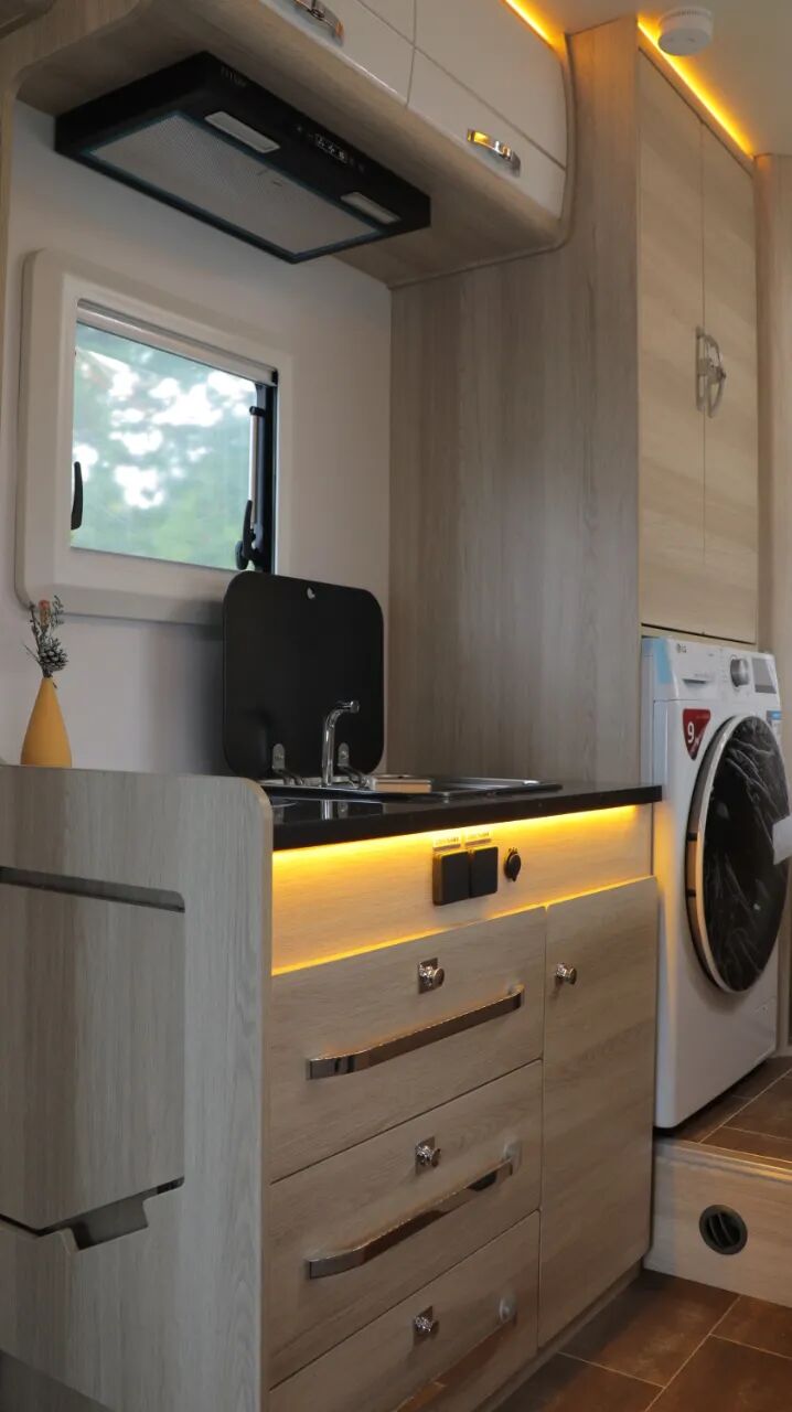 生活区厨房位于车内右侧区域,采用一体式橱柜设计;