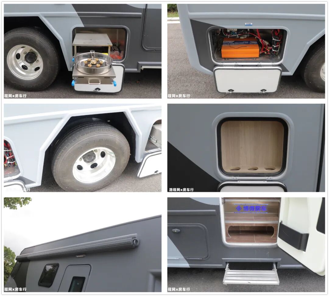 车身右侧设有房车专用4米遮阳棚(带LED灯)、户外照明灯、黑水箱、外置储物舱、电动踏步、车外淋浴器、外挂野餐桌板+可放5公斤煤气仓、外置花洒水龙头等,满足户外不同场景所需,同时右侧底部还设有房车专用外拉燃气灶满足你在驻车时户外烹饪的需求;