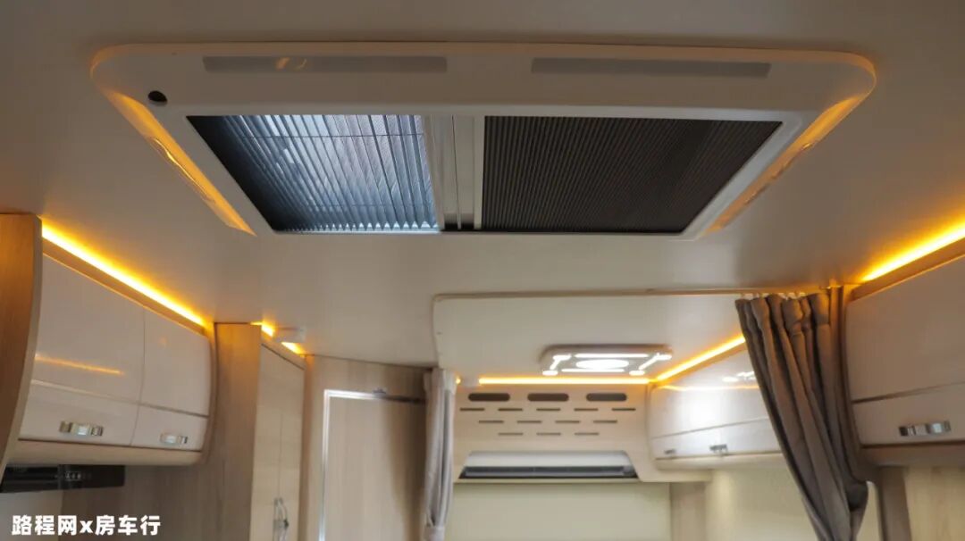 生活区顶部设有可开启天窗加强内部采光、通风;同时顶部还设有LED射灯、氛围灯带加强内部照明效果;