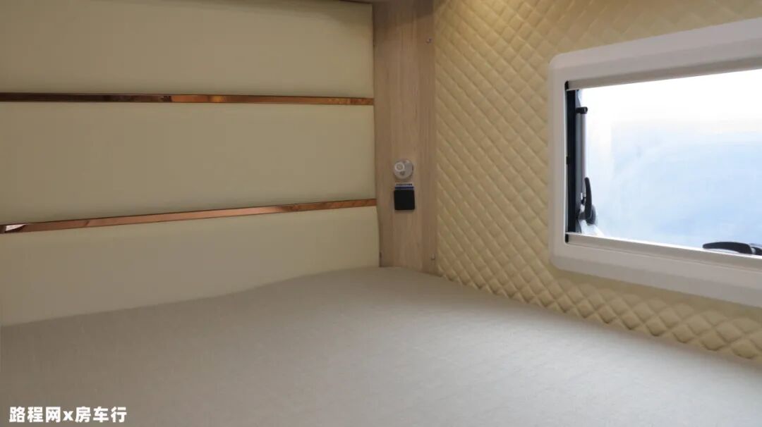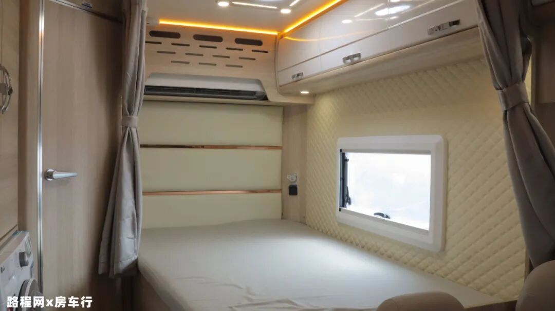 尾部固定休息区共有横床版与纵床版两个版本可供大家选择,本次为大家展示的是纵置床版本;该版本在尾部纵向放置了一张尺寸为2200x1200mm的双人床(与横床版尺寸一致),上方搭载多组吊柜,侧方配有外推窗,尾部设有家用空调方便休息时使用;床上同样铺设高密度海绵床垫提升睡眠舒适度;并设有隔断帘,为内部休息人员营造私人空间;
