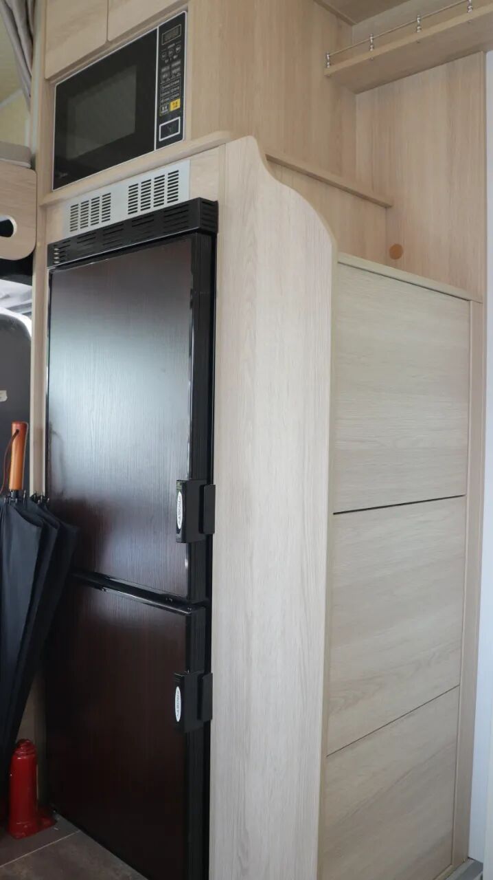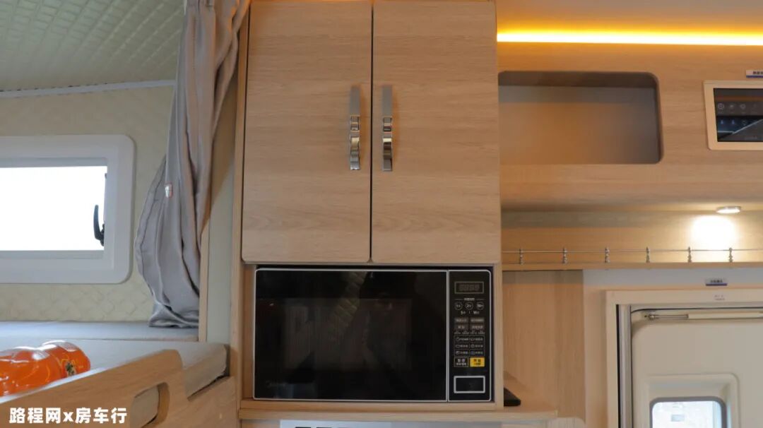 微波炉下方则是一台房车专用148L大容量双开门冰箱,满足长期旅行时存放大量食材的需求;
