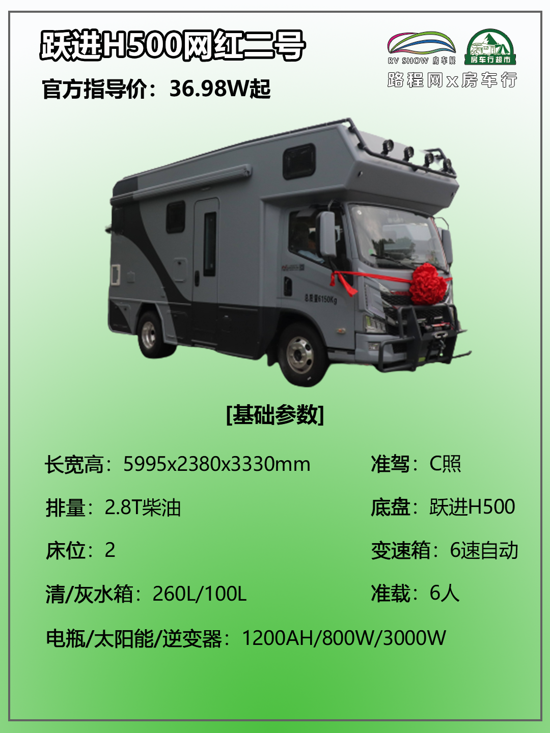水电方面跃进H500网红二号轻卡房车标配了260L清水箱、100L灰水箱、1200AH锂电、800W电站级硬板太阳能、3000W充逆变一体机等设施,目前这款车的官方指导价为36.98W起,大家觉得这款车怎么样呢?欢迎下方评论留言!