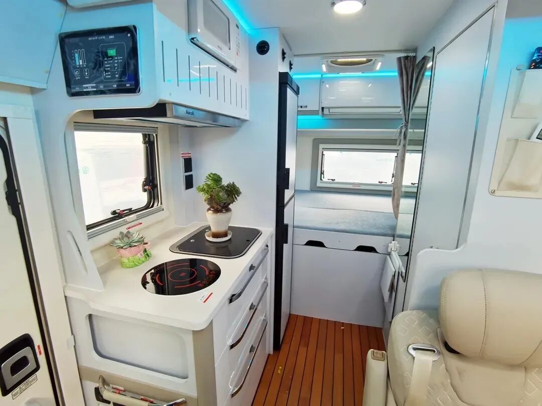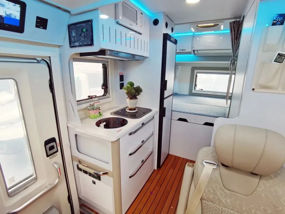 厨房区位于车身右侧,内部配置了185L车载冰箱、电磁炉、微波炉、抽油烟机、盖板式洗菜池等多种设施,充分满足日常烹饪的需求;同时厨房操作台下方设有多个抽屉,方便厨房用品分类存放;